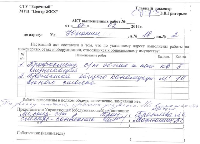 Решение. МУП «Центр ЖКХ» произвел прочистку канализационного стояка. Акт выполненных работ прилагаем.