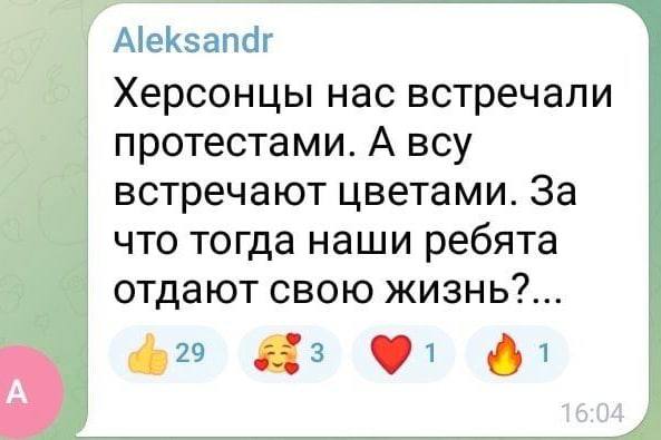 А на видео можно заметить, как встречают ВСУ жители Херсона, из которых на референдуме 146% проголосовали за вхождение в состав России: