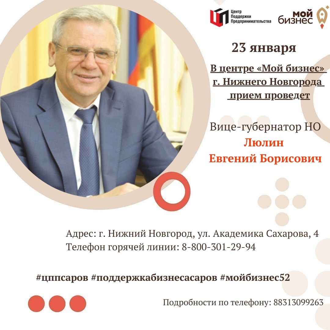 В четверг 23 января в центре «Мой бизнес» г. Нижнего Новгорода личный прием проведет вице-губернатор Нижегородской области Люлин Евгений Борисович (о времени мы сообщим дополнительно)!