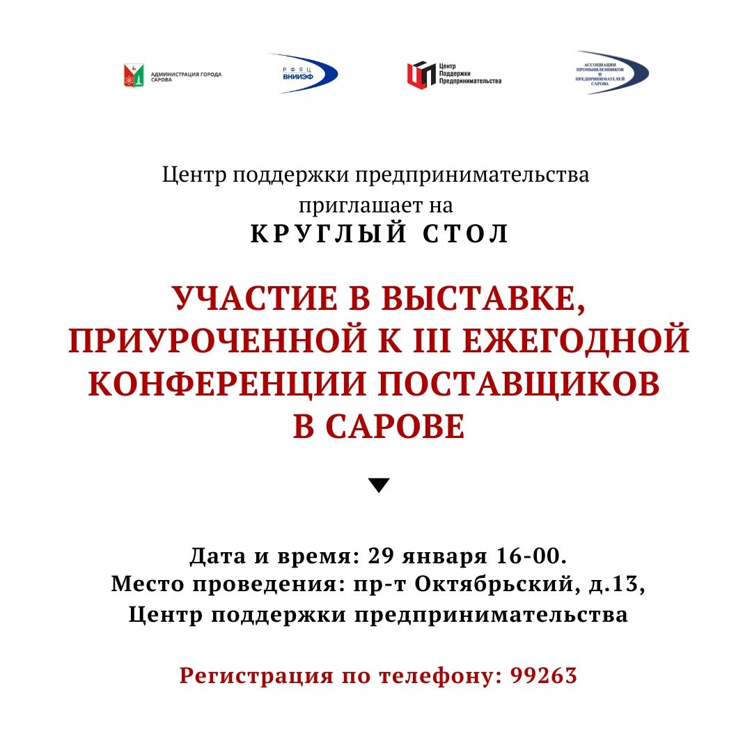 29 ЯНВАРЯ В 16:00 В ЦЕНТРЕ ПОДДЕРЖКИ ПРЕДПРИНИМАТЕЛЬСТВА СОСТОИТСЯ КРУГЛЫЙ СТОЛ ПО ВОПРОСАМ УЧАСТИЯ В ВЫСТАВКЕ.
