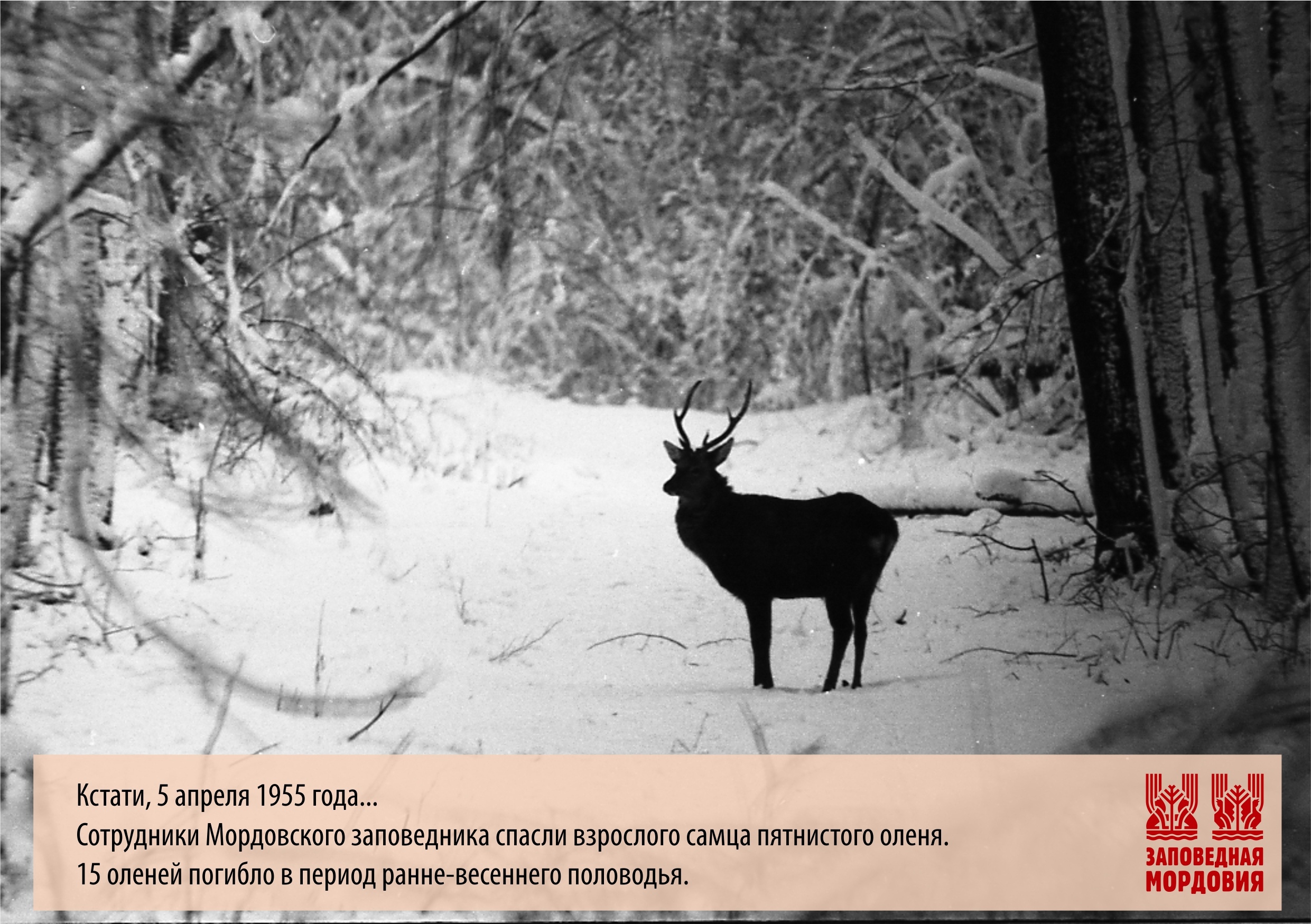 В 1955 году 15 пятнистых оленей погибло в период ранне-весеннего половодья. После продолжительной оттепели в середине марта началось бурное таяние снега, в результате чего водоёмы в короткий срок наполнились и стали выходить из берегов.
