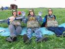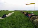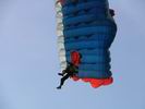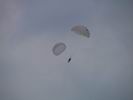 Ждём нашего вылета. Было два небольших происшествия: Один спортсмен на «крыле» сел прямо около аэродромного «колдуна» (похож на большой сачок), и купол оказаля на «колдуне» (см. фото) — к счастью, не порвали. И у одного перворазника на высоте 300 м автоматически раскрылся запасной парашют, который он забыл расчековать, прошел между ног, и там уже наполнился. Товарищ висел горизонтально, ему предстояла посадка на пузо, но к счастью он успел извернуться и сел на ноги. Его стремительный полёт видно на фотографии.