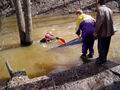 Самые последние ворота, финишные, были установлены не перпендикулярно течению, а вдоль. Чтобы в них проскользнуть, нужно на полной скорости повернуть вбок. С одним из каякских плавунцов эти ворота сыграли злую шутку: на повороте его каяк перевернулся вверх брюхом, а головой, соответственно, вниз. Метров через десять спортсмен выбрался под водой из каяка и, борясь с течением, выкарабкался на берег (вода, напомню, ледяная). Ну чисто морж!
