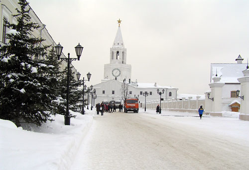 В кольце русских башен, рядом с русскими куполами, внезапно спустившимся с небес эльфийским замком выглядит мечеть Кул Шариф. Это нечто потрясающее. Многоминаретная мечеть с бирюзовыми куполами сказочно красива, и никакими фотографиями этого не передать.