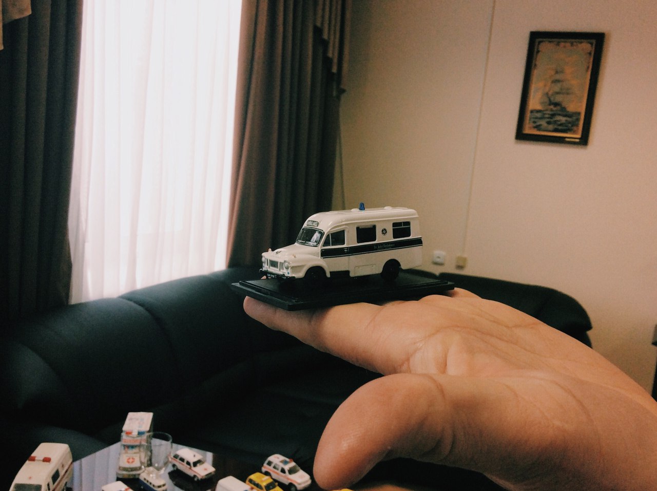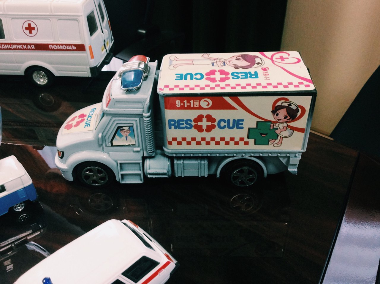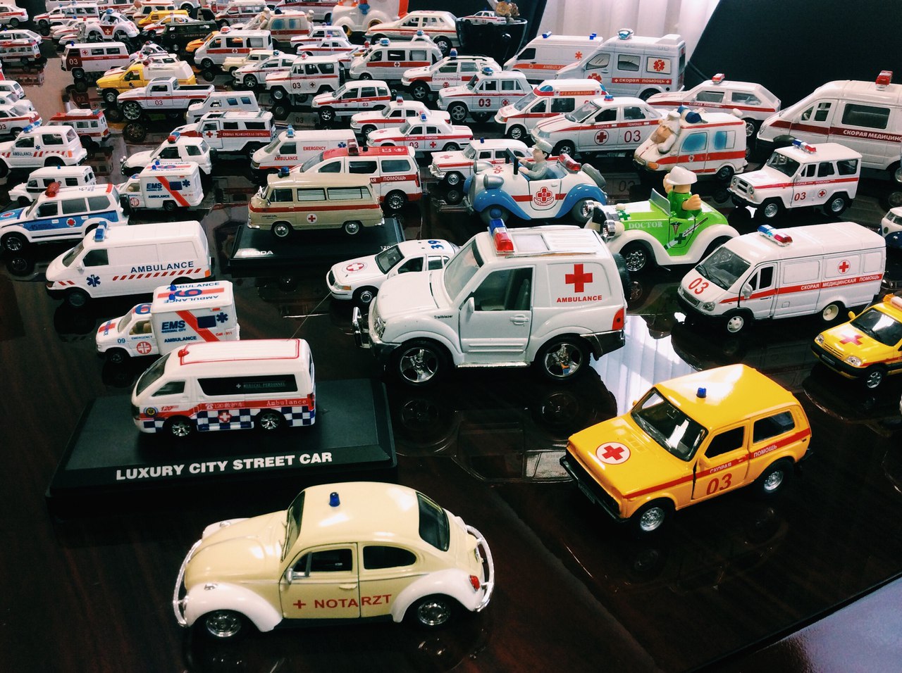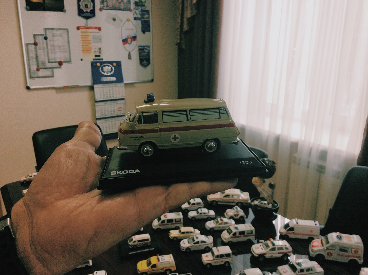 Спустя полчаса доходим до моей главной цели — личного кабинета главврача. К моему приходу Владимир Кириллович успел расставить треть своей коллекции на рабочем столе. Я вижу больше сотни самых разномастных машинок скорой помощи, про себя сетуя, что со мной нет детей. Очень уж хотелось бы увидеть их реакцию на это зрелище. Хозяин кабинета, видя заинтересованность, кидается к столу и начинает рассказывать про каждую модельку в отдельности: «Вот эта была самой первой. Мне ее подарил в благодарность пациент, а я тогда порадовался — впервые ведь что-то действительно оригинальное принесли, а не стандартный „джентльменский набор“ — и поставил на стол. Она не то чтобы старинная, но редкая: найти в продаже кареты, снятые с производства, очень сложно».