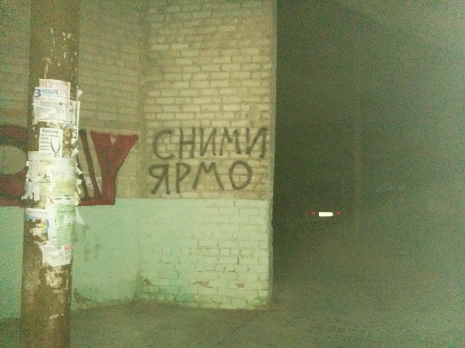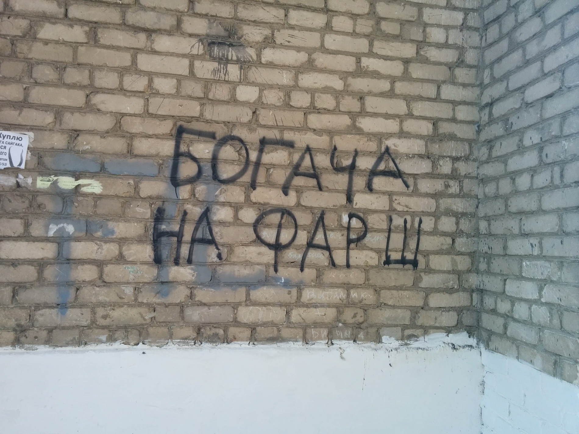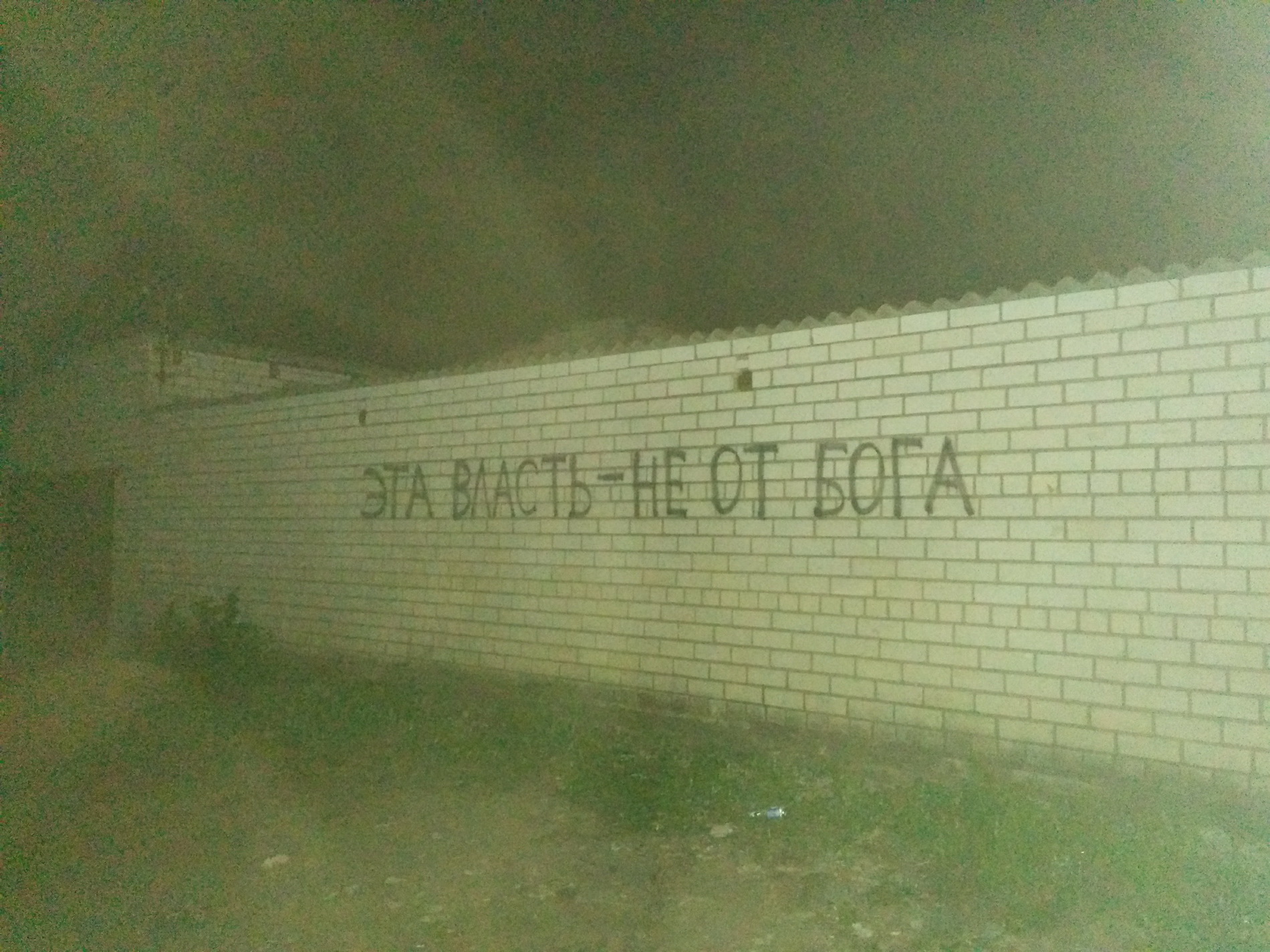 Из газеты я узнал, что местная дума приняла бюджет на этот год единогласно. По отзывам местных — каких-то фракций, объединений и прочих могучих кучек в думе нет. Зато есть понимание, что делают они общее дело и поэтому все, кто при этой власти находится, исповедуют последовательную политику. А вот после митингов сторонников Навального в городе попер креатив, выразившийся в граффити на стенах. Видать, молодой урюпинец таки настроен оппозиционно.