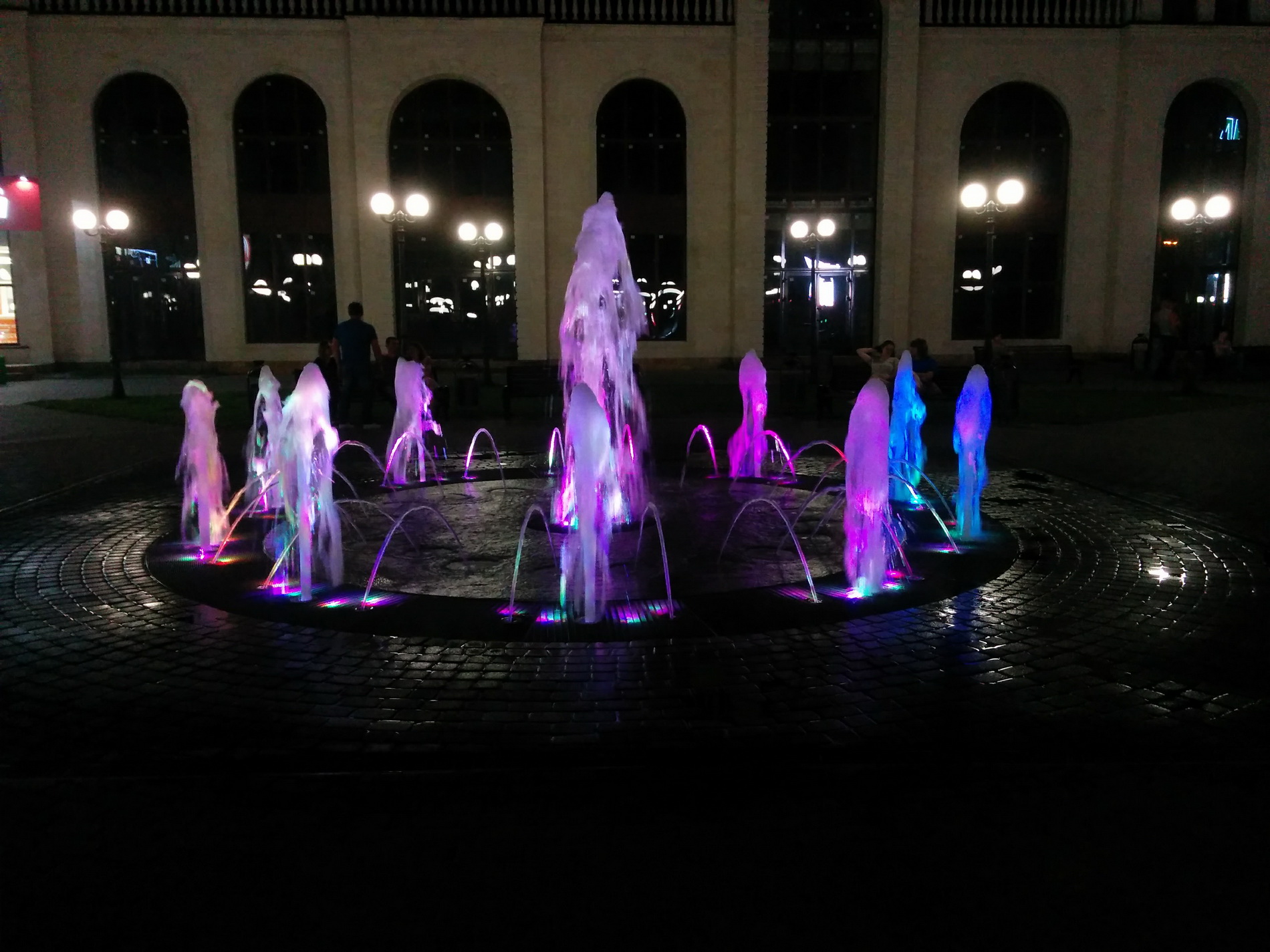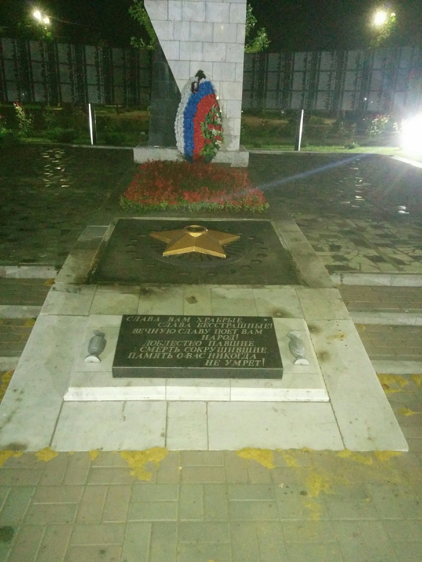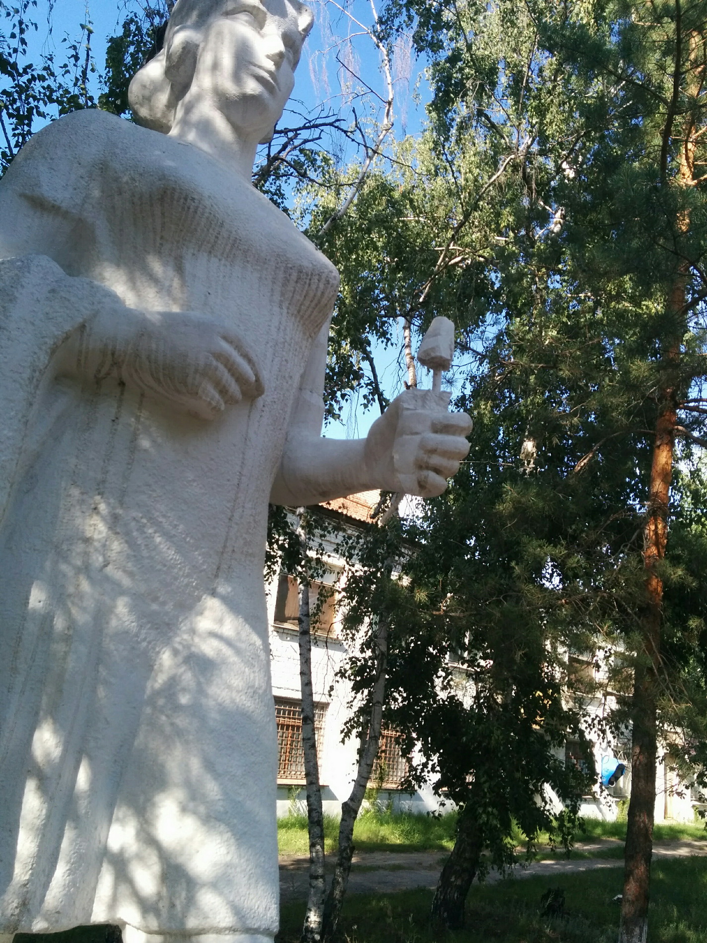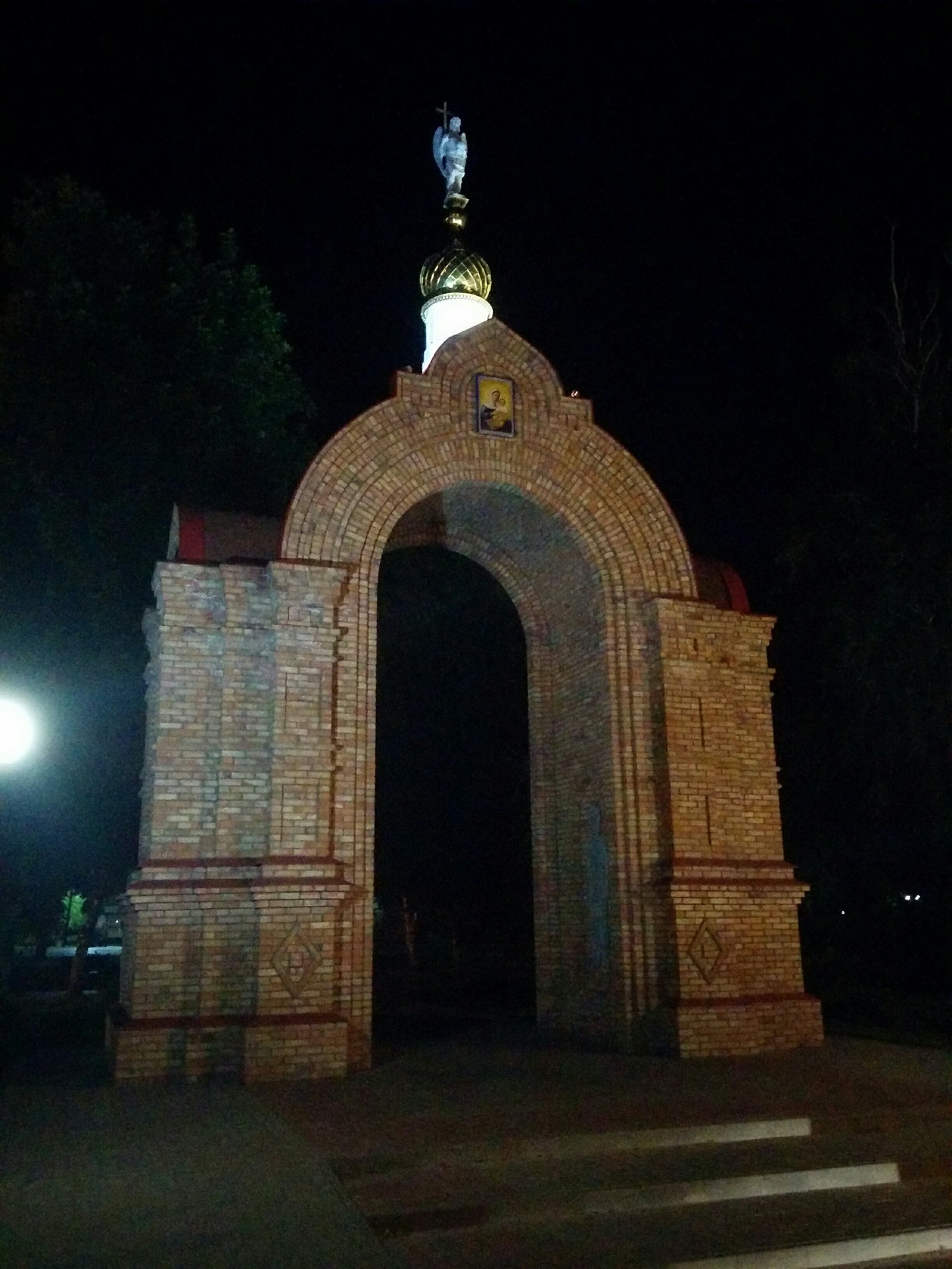 Кстати, свет от этого арт-объекта очень красиво ложится на концентрически выложенную вокруг плитку. Есть арка, построенная на месте такой же, но разрушенной. Пример народного православного краудфандинга: 90 урюпинцев скинулись и построили тоже, я считаю, арт-объект. Очень хороший, кстати говоря. Не помпезный, выложенный из терракотового с неровной структурой кирпича и очень грамотно подсвеченный — производит крайне положительное впечатление. Отдельно стоит отметить памятник девушке с эскимо возле здания трикотажной фабрики, которая на самом деле прядильщица, у которой веретено развалилось до состояния шоколадного батончика.