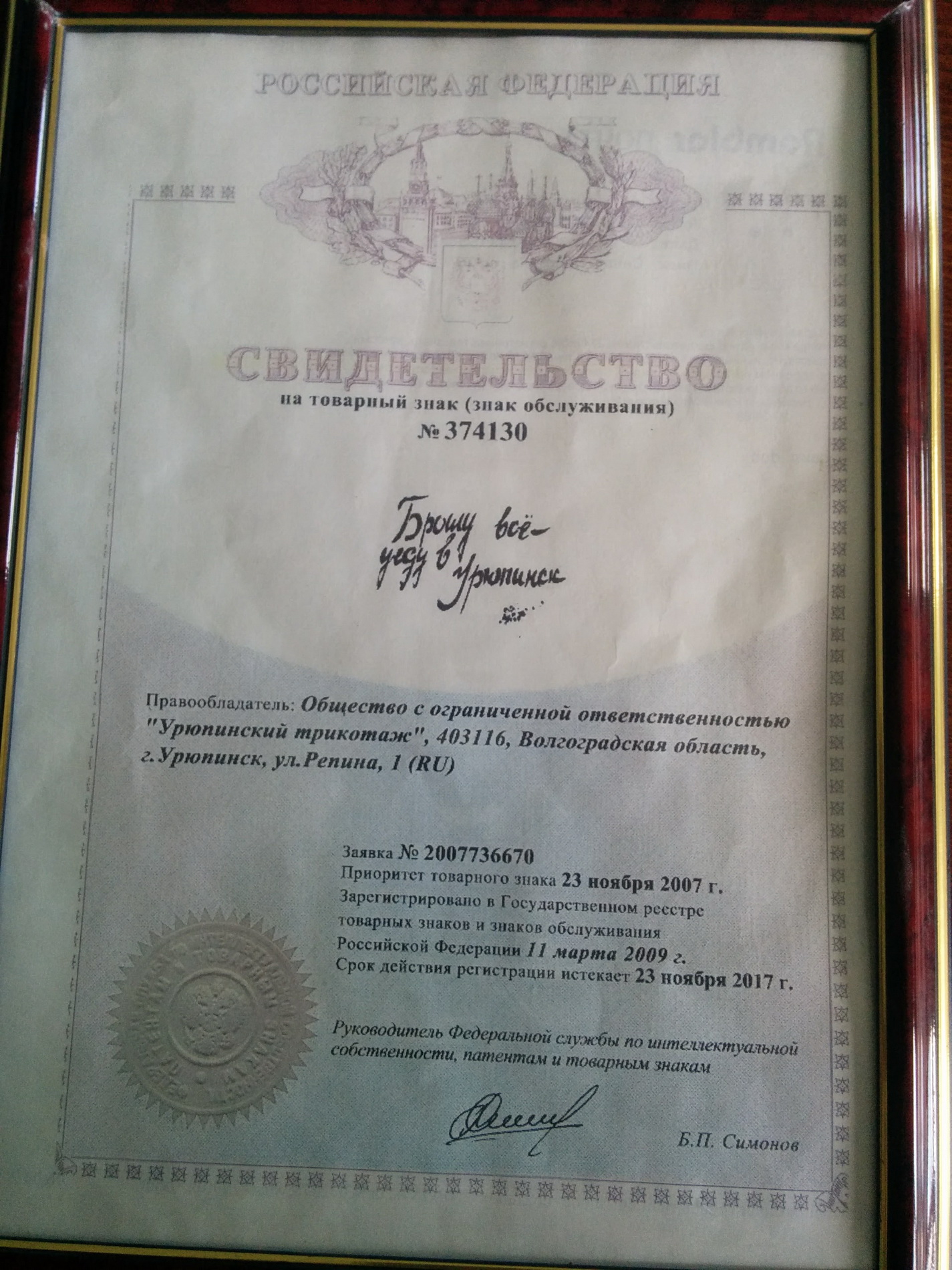 А чтобы окончательно тебя добить, на встрече с руководством урюпинской трикотажной фабрики тебе показывают оформленное в 2007-м и продлённое в текущем году свидетельство о регистрации права на особое графическое исполнение этой «оригинальной фразы». Так что если где-то вы встретите урюпинца, не надо поражать его мнимой оригинальностью.