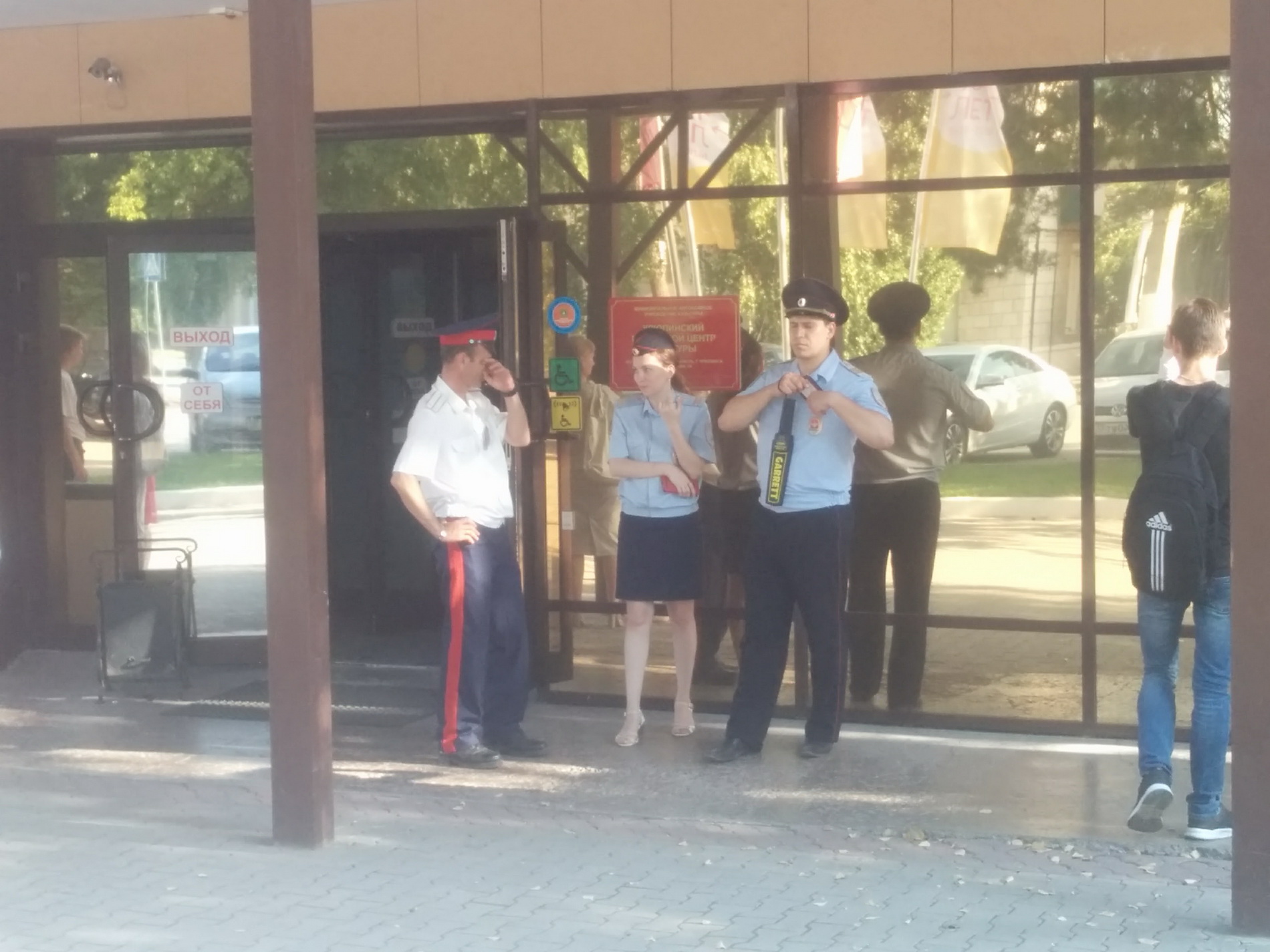Так или иначе, но вот полицейский патруль, охранявший ДК, в котором проходил форум, был укомплектован поедающим мороженное чубатым казаком. К нему в довесок прилагался мужчина-полицейский и хрупкая девушка в погонах.