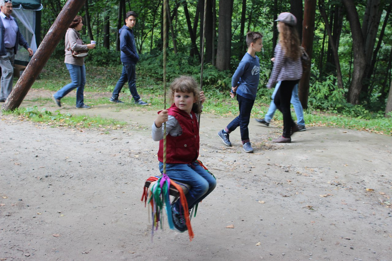 Поскольку выехали поздно, предвкушали уже сомнительное удовольствие установки шатра и навесов в темноте, но нет — организаторы фестиваля разместили нас на деревянной веранде летнего кафе, где и ужин нормально приготовили, и с комфортом разместились спать. И ещё рядом с кафе совершенно роскошные качели — я с детства не катался. Судя по восторженным физиономиям одноклубников, они тоже.