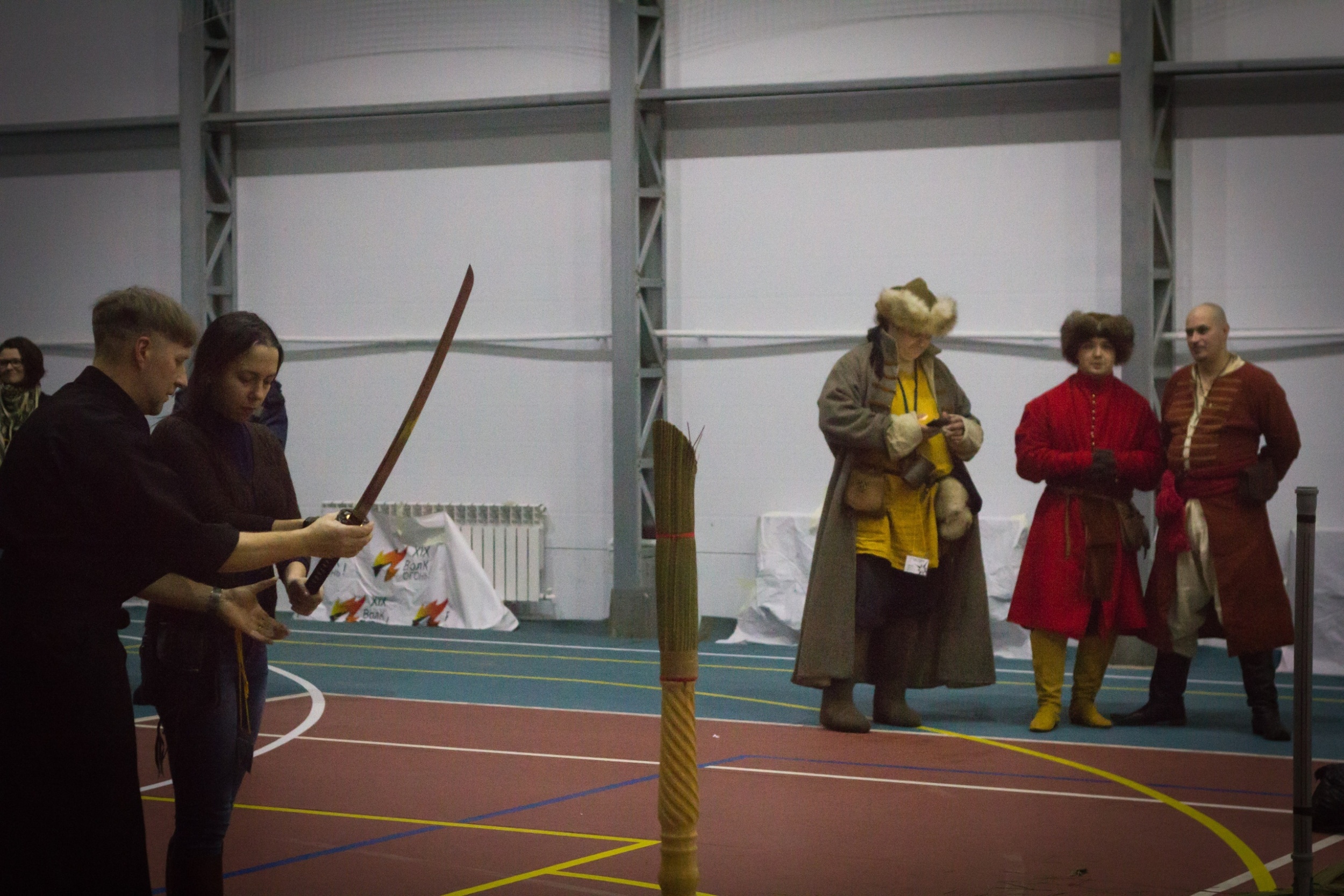 Дальше пошел посмотреть на тамасегири (японское боевое искусство, в котором практикуется тестовая рубка всяких предметов катаной). Увы, мне достался лишь уже распушенный кусок циновки, который разрубить казачьей шашкой уже не получилось.