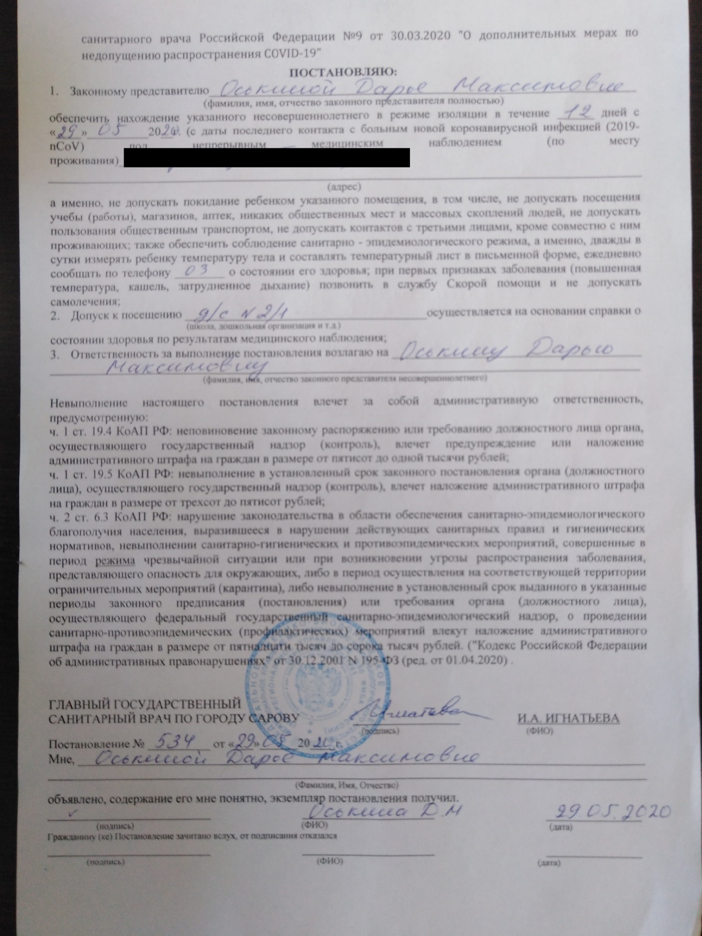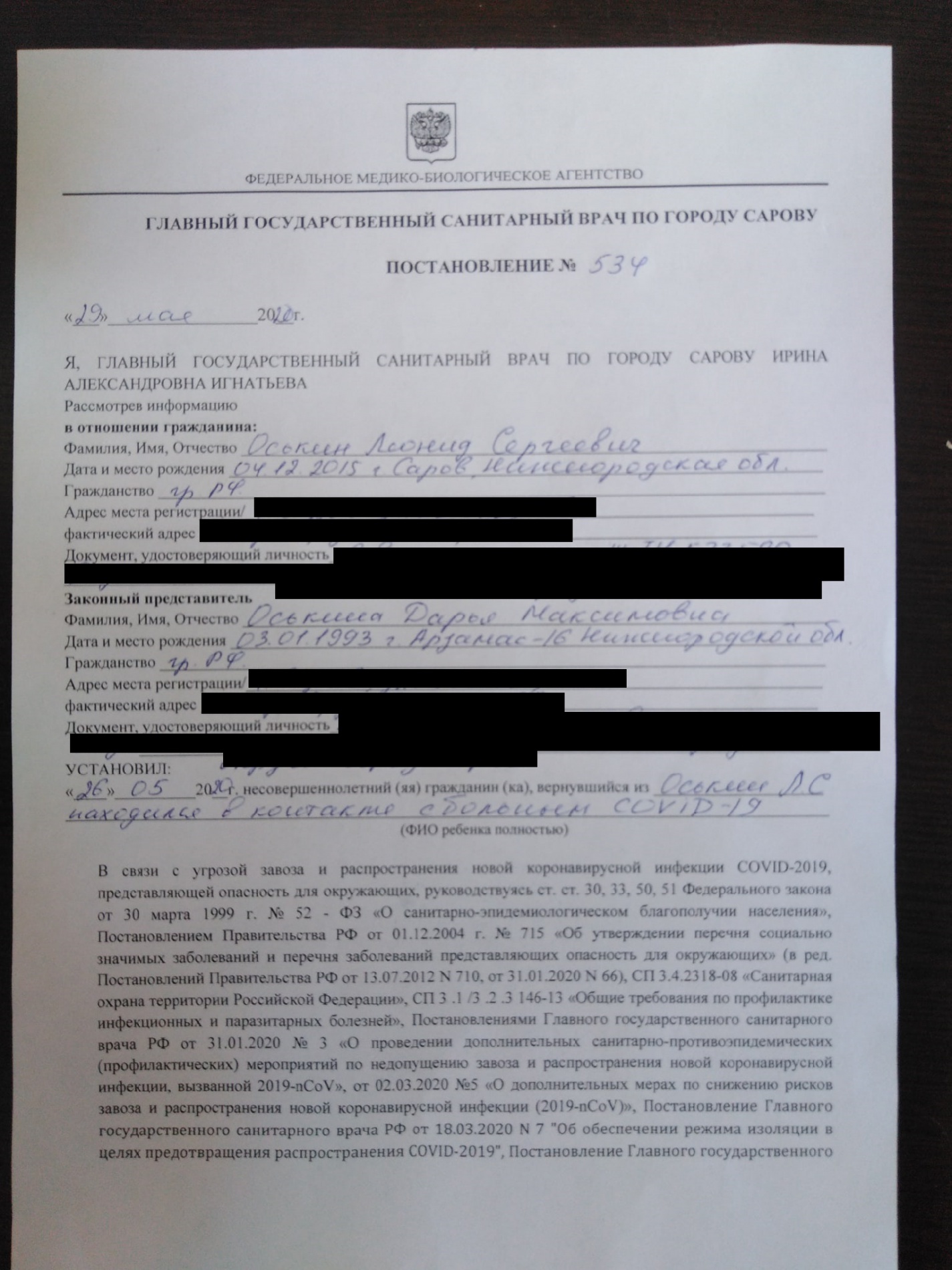 Спустя примерно час после беседы с СЭС к нам в дверь постучался молодой человек в белом халате с логотипом РФЯЦ-ВНИИЭФ, в двух масках и перчатках, и с величайшей осторожность передал две бумажки, в одной из которых просил расписаться. Это оказалось постановление главного санитарного врача нашего города о посадке нас на карантин. Самое забавное, что теоретически я могла и отказаться. Правда, какие санкции мне бы грозили в таком случае, я вообще не в курсе.