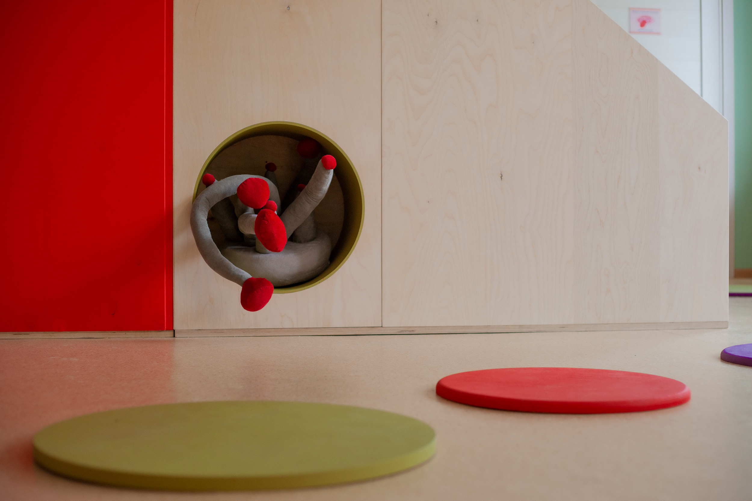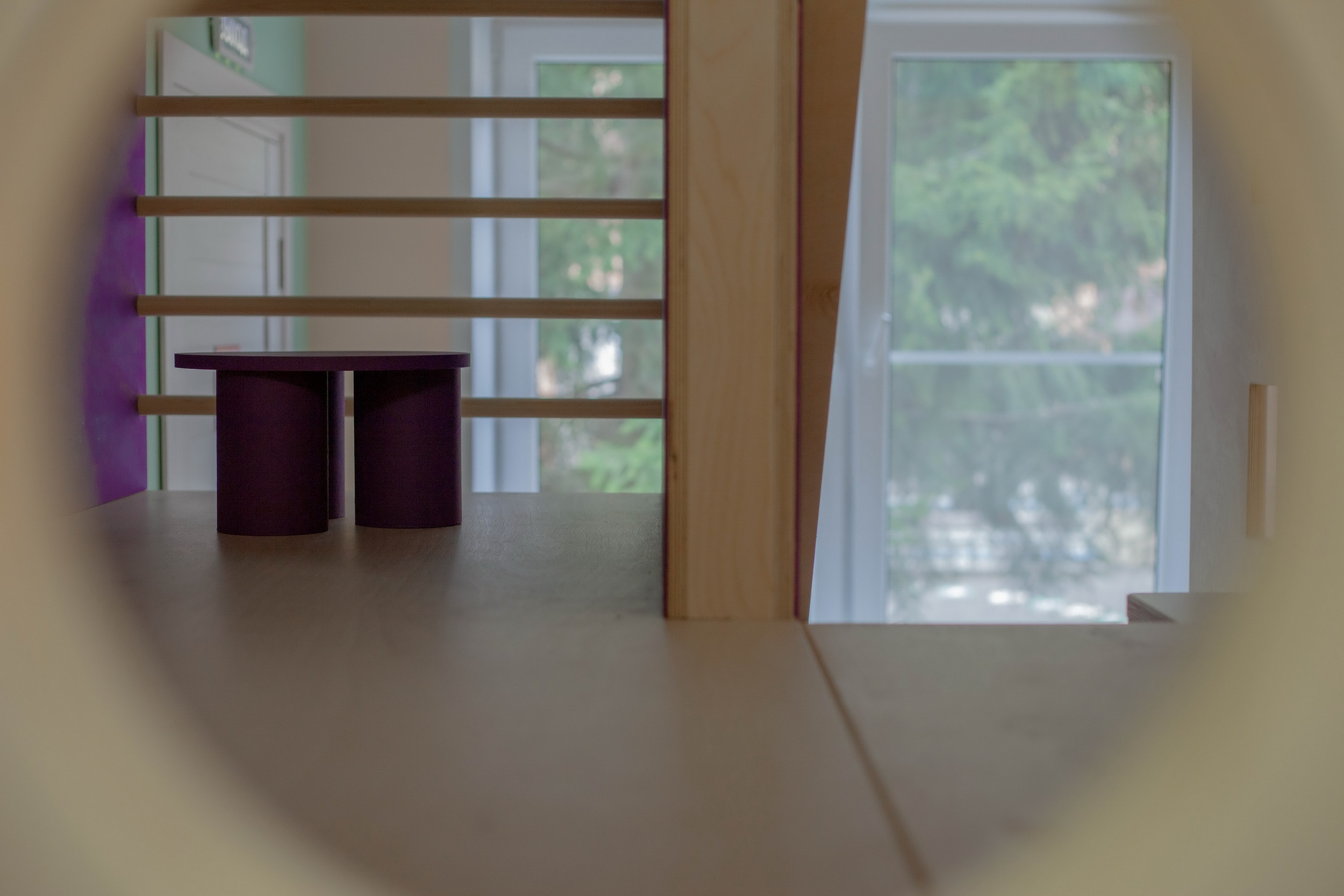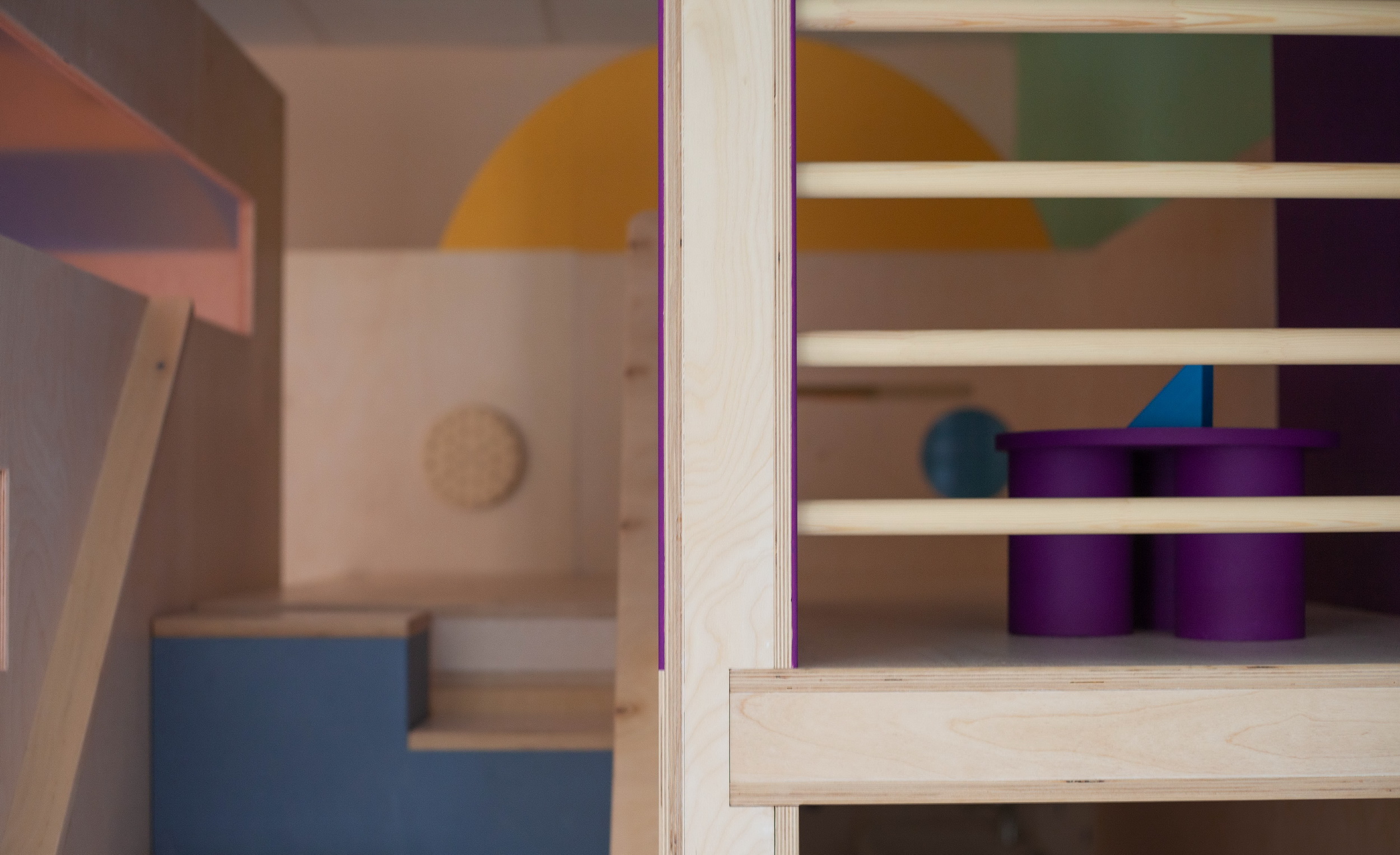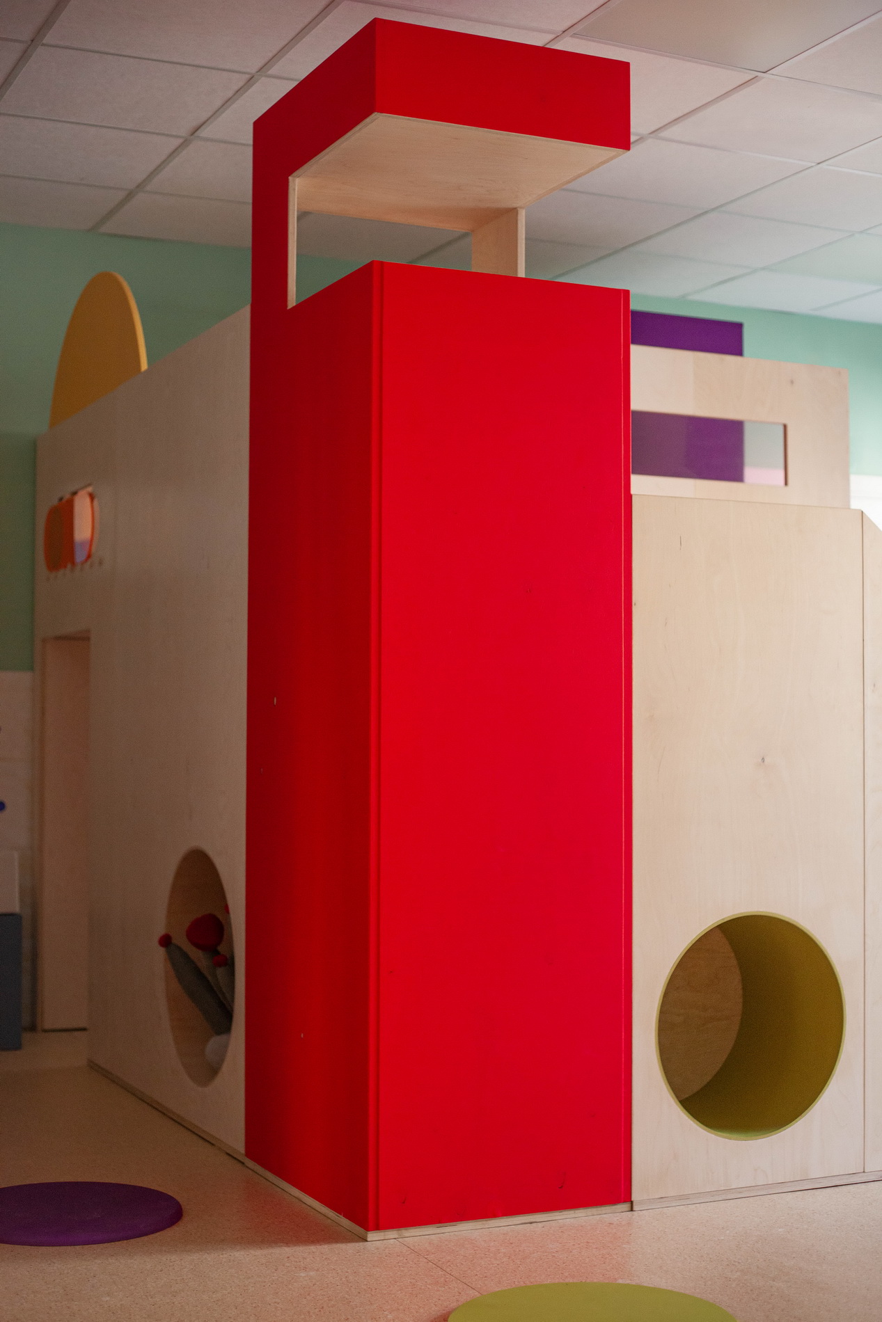 Хотя у нас уже как 2 года есть собственное небольшое столярное производство, этот проект в подобных ограниченных условиях стал для нас большим профессиональным вызовом и от этого очень интересным. Мы сделали его от концепции и прохождения экспертизы на пригодность конструкции к использованию в детских учреждениях до создания на собственном производстве и собственноручного монтажа на месте.