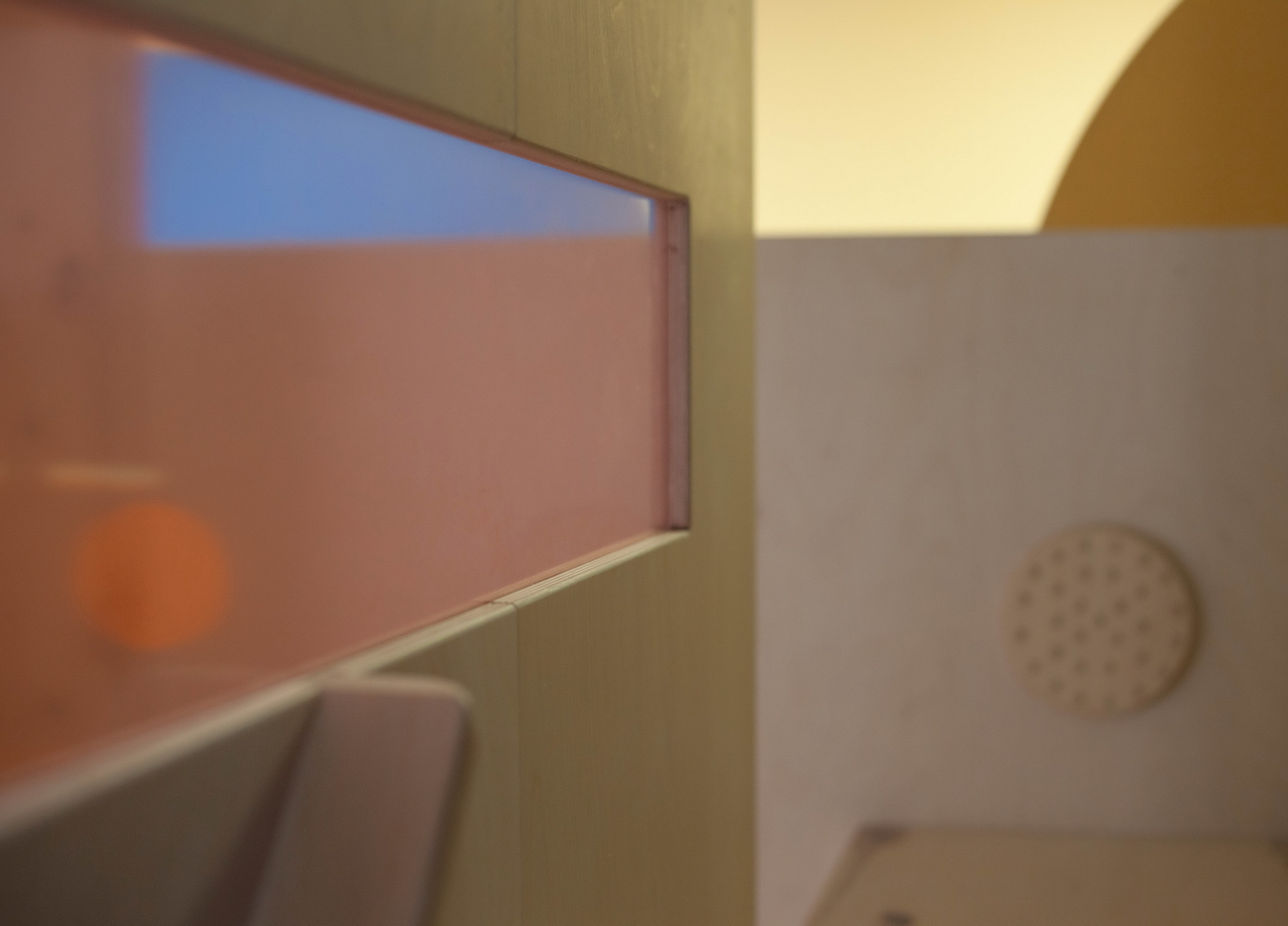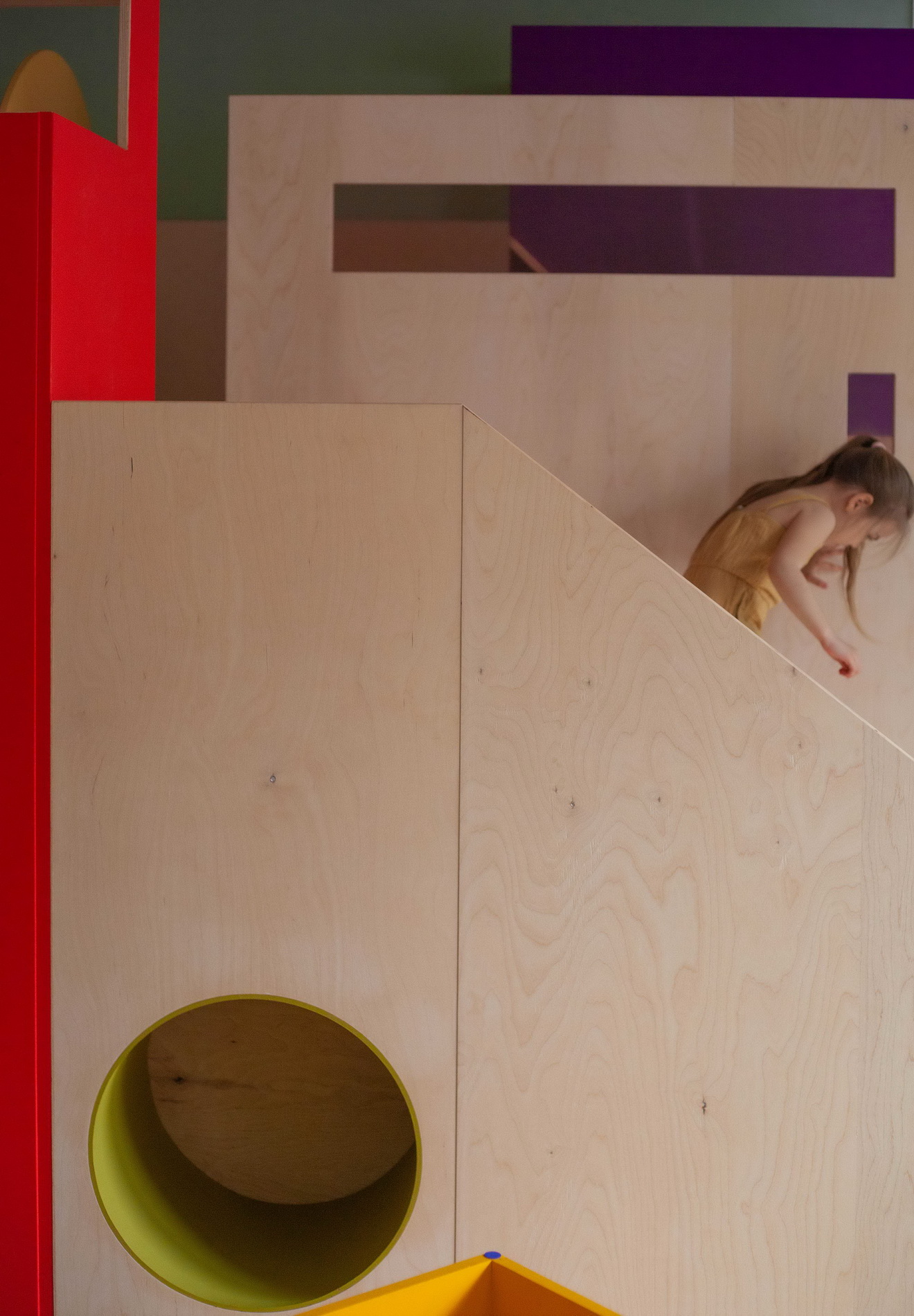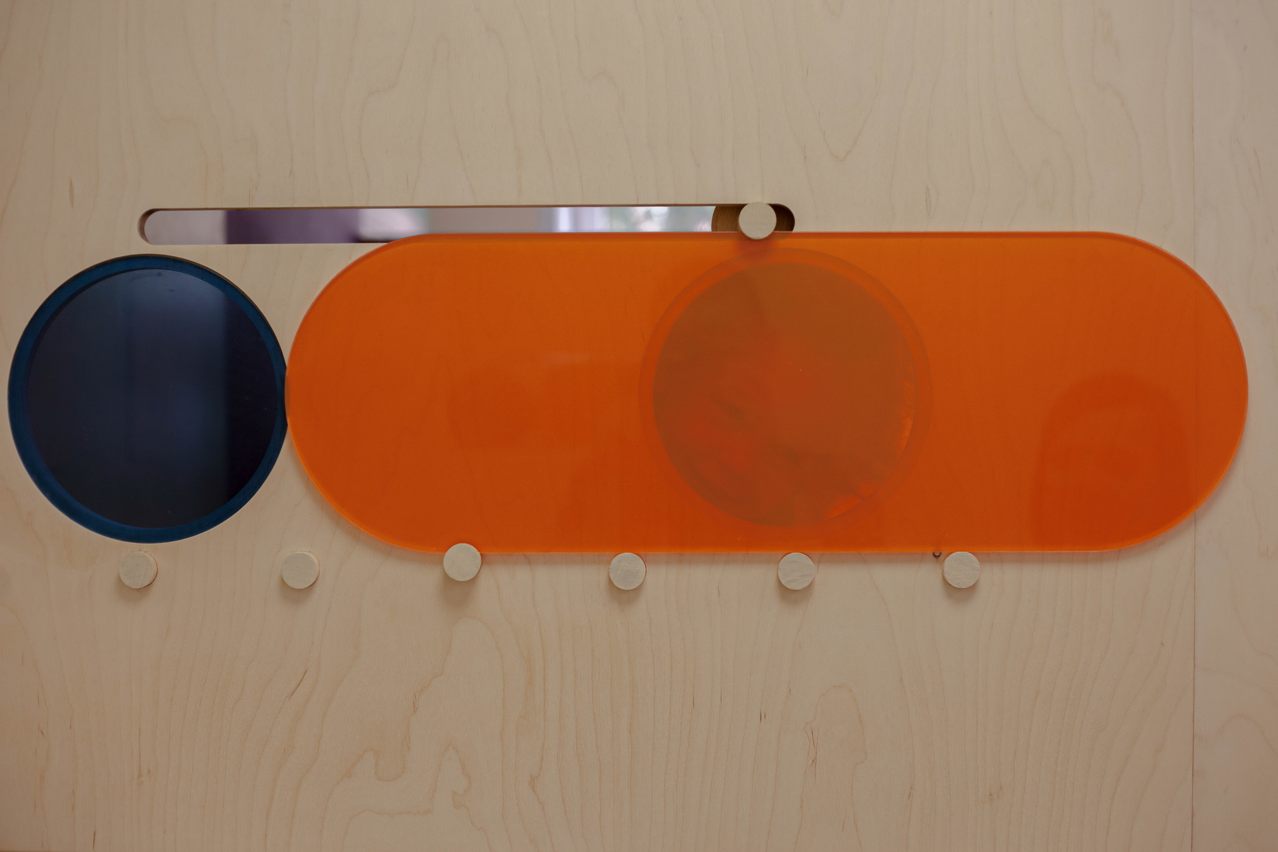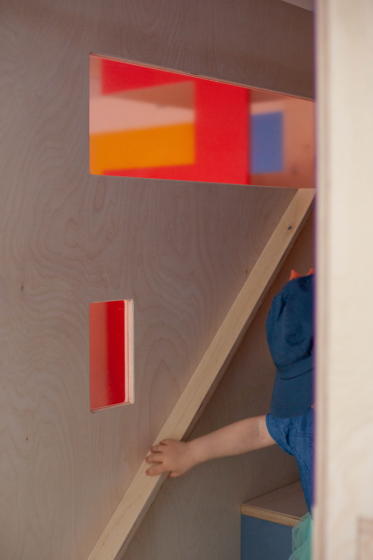 Вся игровая площадка сделана из фанеры, а чтобы добавить интерактива и сделать интереснее пространство, мы добавили вставки из оргстекла. Например, мы решили добавить механизм, в котором один элемент подвижный и позволяет при перемещении влево-вправо наблюдать, что происходит при наложении стекол двух разных цветов. Это же здорово: посмотреть на окружающий мир сквозь разные цвета.