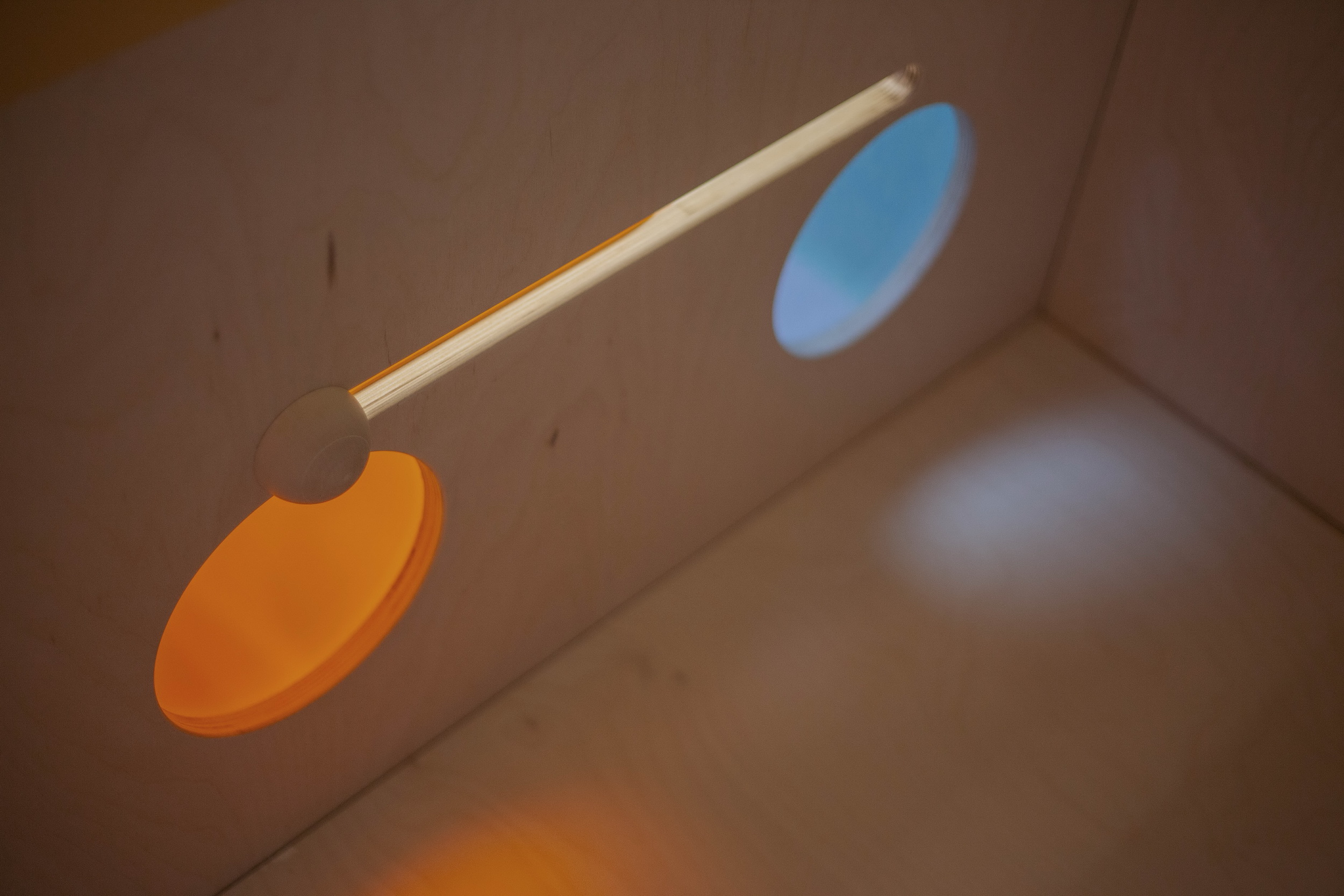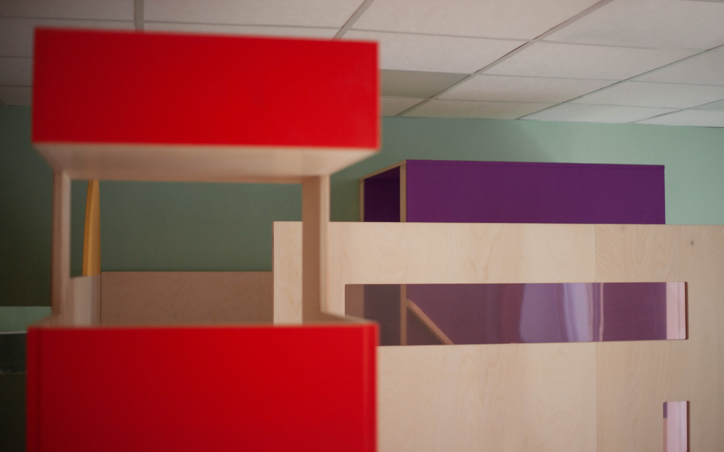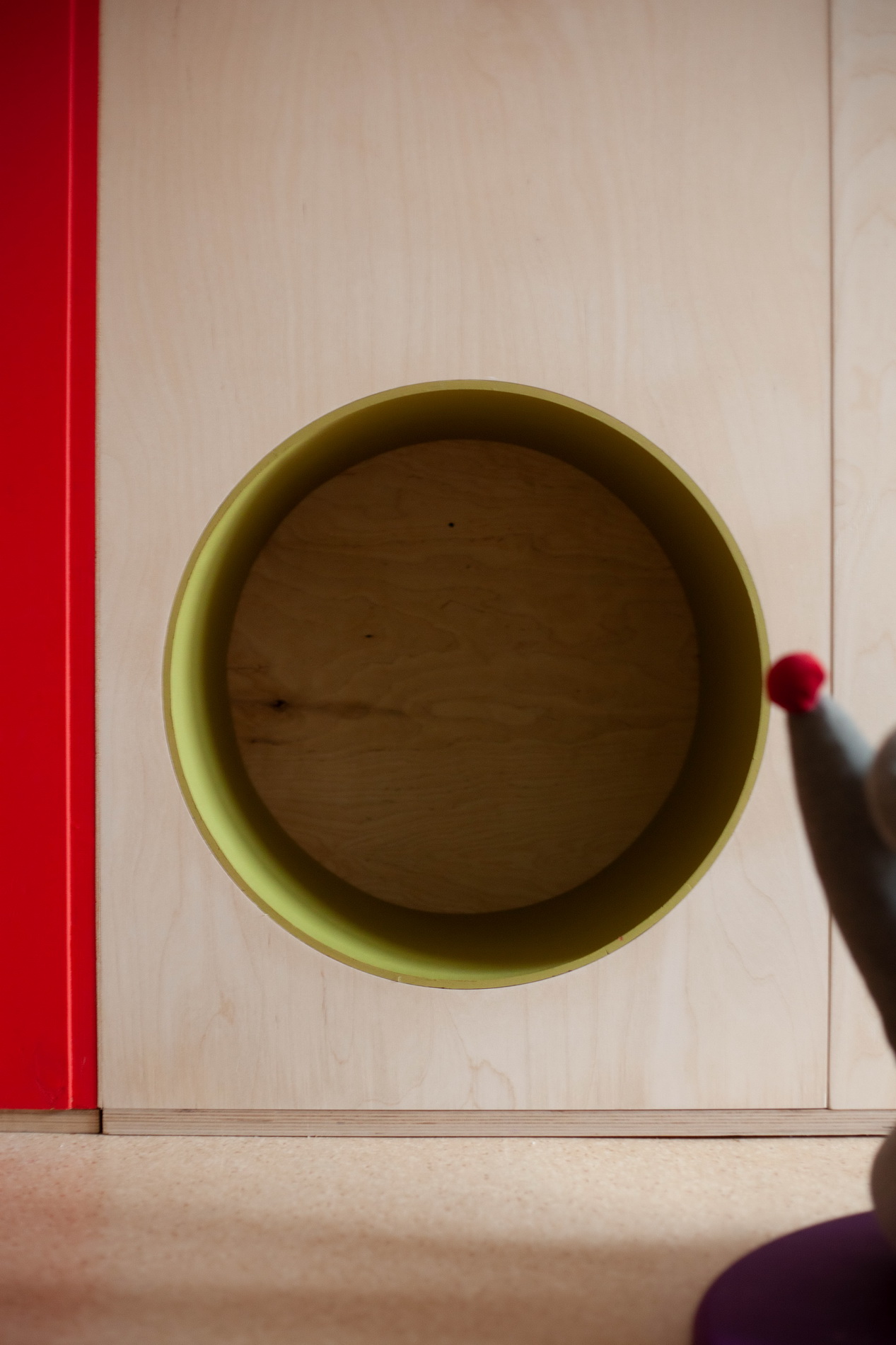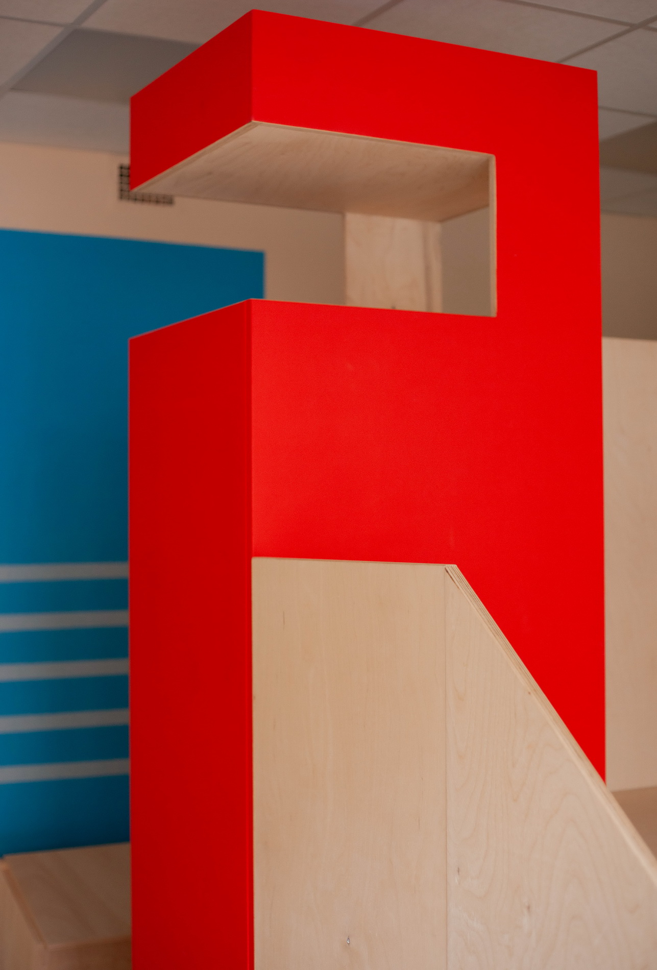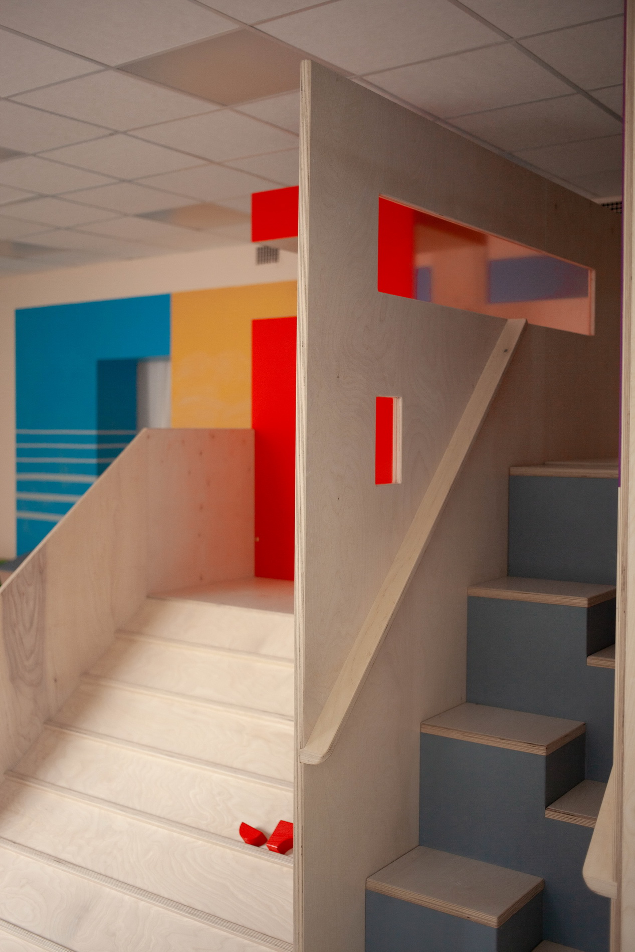 Вся игровая площадка сделана из фанеры, а чтобы добавить интерактива и сделать интереснее пространство, мы добавили вставки из оргстекла. Например, мы решили добавить механизм, в котором один элемент подвижный и позволяет при перемещении влево-вправо наблюдать, что происходит при наложении стекол двух разных цветов. Это же здорово: посмотреть на окружающий мир сквозь разные цвета.