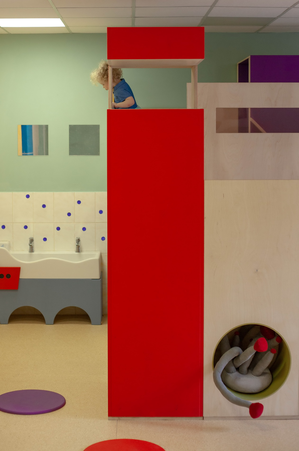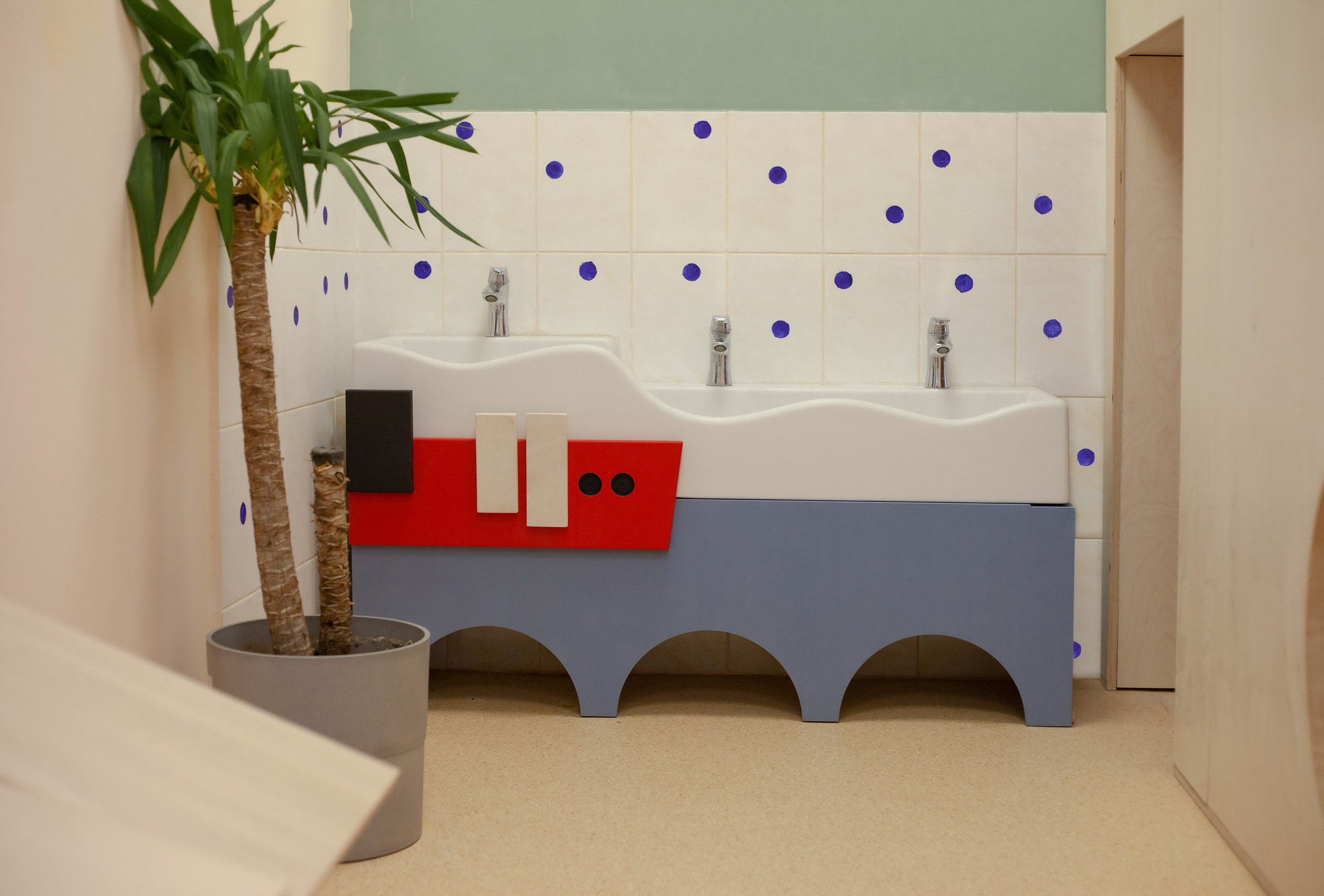 Если есть остров, значит должна быть и вода, таким образом, ландшафтная раковина стала неотъемлемой смысловой составляющей комплекса. Восхищаемся этим решением, потому что подобные приёмы распространены, например, в детских садах Берлина, когда дети могут играть с водой именно в игровом пространстве, а не просто мыть руки в отведённом для этого месте — санузле.