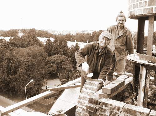 Снизу новые золотые веселые главки выглядели крошечными, у ажурных подножий барабанов трудились фигурки каменщиков. Большой купол уже оделся медью, но еще стучат молотки кровельщиков. Кто там работает, на высоте? Мы поднялись на самый верх, на кровлю, чтобы поговорить с теми, кто своими руками возвращает красоту миру.