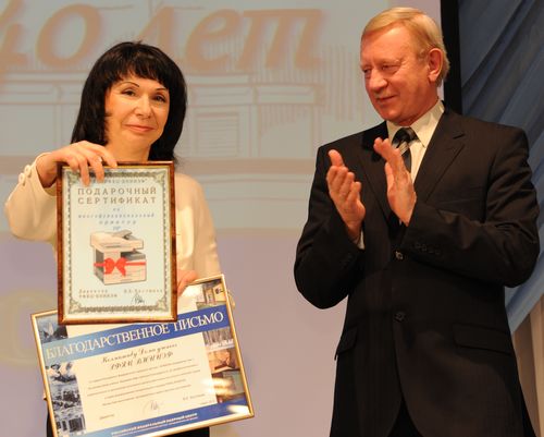 За профессионализм и компетентность в организации культурного досуга работников Института и жителей города, а также формирование положительного имиджа РФЯЦ-ВНИИЭФ Вячеслав Петрович вручил коллективу в лице руководителя Дома ученых Е. Шаповаловой благодарственное письмо директора В.Костюкова. Кроме того, нагрудным