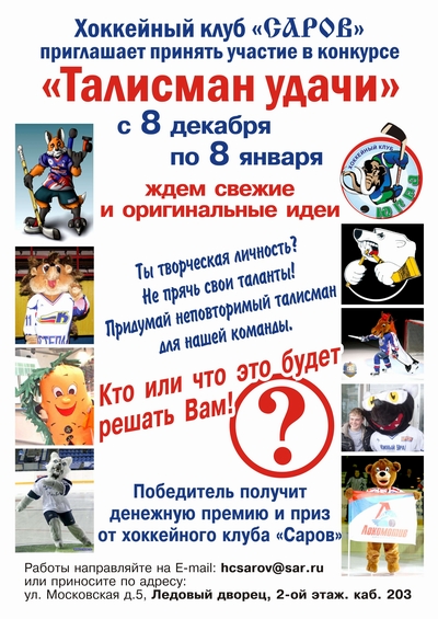 Помоги нашему хоккейному клубу обрести собственный талисман, который будет приносить команде удачу! Реальный или вымышленный персонаж будет принимать самое активное участие в жизни «Сарова» и поддерживать саровскую дружину вместе с Вами на домашних матчах. Кто или что это будет, решите, Вы, уважаемые болельщики!