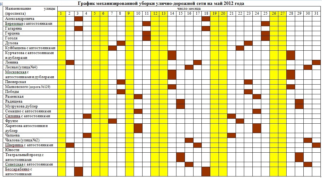 В департамент городского хозяйства утвержден график механизированной уборки территорий, за которые отвечает Дорожно-эксплуатационное предприятие. Работы должны начинаться в 8−00, заканчиваться не ранее 17−00.