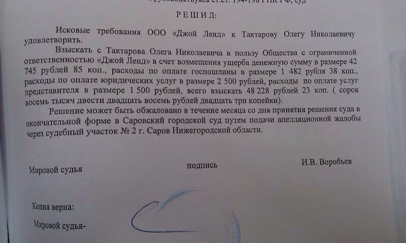 Суд удовлетворил исковые требования к Олегу Тактарову и обязал выплатить 48 000 рублей