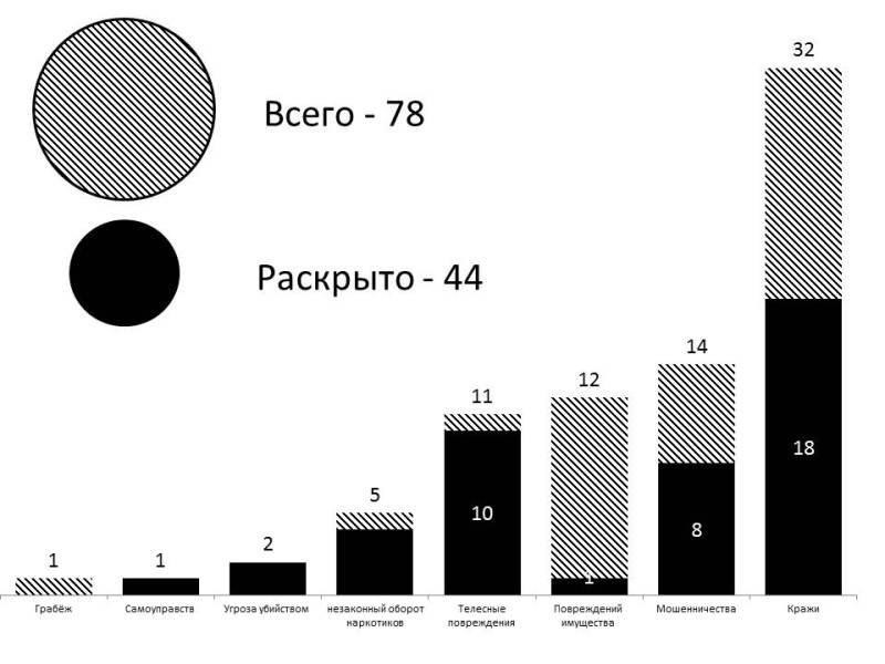 Зарегистрировано 78/40. Кражи 32/18, из квартир 3/2, из автомашин 1/0, в общественных местах 20/16, прочих 8/0. Грабеж 1/0, мошенничество 14/8, незаконный оборот наркотиков 5/4. Самоуправств 2/2, угрозы убийством 11/10. Причинений телесных повреждений 11/10, на бытовой почве 8/8, из хулиганских побуждений 3/2. Умышленное повреждение имущества 12/1. ДТП 47. Административных правонарушений 879. Нарушение паспортных правил 8. В сфере БДД 649 (в том числе 12 за управление транспортным средством в состоянии алкогольного опьянения). Мелкие хулиганства 24. Появление в общественных местах в пьяном виде 77, распитие спиртных напитков в общественных местах 58.