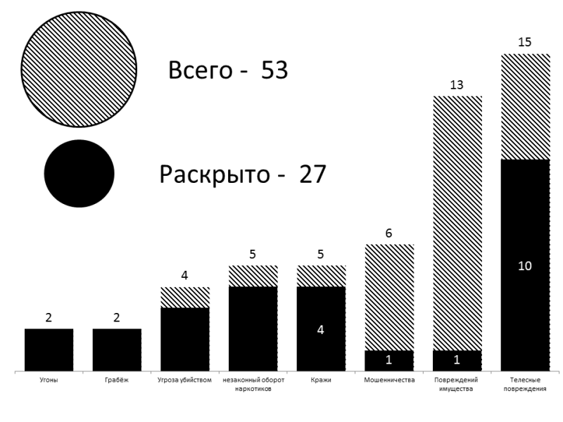 Зарегистрировано 53/27 обращения о происшествиях и преступлениях. Краж — 5/4, из квартир — 1/1, из гаражей — 1/0, в общественных местах — 3/3. Грабежей — 2/2. Мошенничеств — 6/1, незаконного оборота наркотиков — 5/4. Угонов — 2/2. Угроз убийством — 4/3. Телесных повреждений — 11/10, из них на бытовой почве — 5/5, из хулиганских побуждений — 6/5. Повреждений имущества — 13/1. Административных правонарушений — 247, из них нарушений паспортных правил — 5. Мелких хулиганств — 17, появлений в общественных местах в пьяном виде — 71, за распитие спиртного в общественных местах — 125.