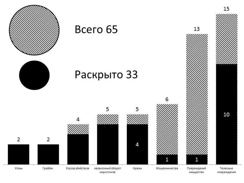 Зарегистрировано 65/33 обращений о происшествиях и преступлениях. Краж — 18/11, из квартир — 2/1, из автомобилей — 3/0, в общественных местах — 7/6, прочих — 6/4. Преступлений экономической направленности 1/0. Мошенничеств — 8/0, незаконного оборота наркотиков — 5/5, самоуправств — 2/2. Угонов — 1/0. Телесных повреждений — 14/11, из них на бытовой почве — 1/1, из хулиганских побуждений — 13/10. Угроз убийством — 1/1. Повреждений имущества — 13/3, дорожно-транспортных происшествий — 23. Административных правонарушений — 768, из них нарушений паспортных правил — 5, в сфере безопасности движения — 567, в состоянии опьянения — 3. Мелких хулиганств — 13, появлений в общественных местах в пьяном виде — 72, за распитие спиртного в общественных местах — 83.