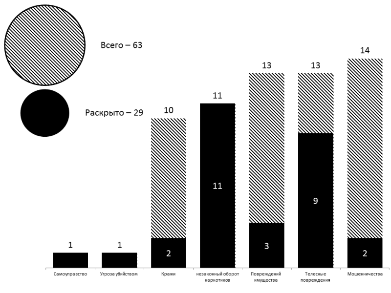 Зарегистрировано 63/29 обращения о происшествиях и преступлениях. Краж — 10/2, из гаражей — 1/0, из машин — 1/0, в общественных местах — 3/2, прочих — 5/0. Мошенничеств — 14/2, незаконного оборота наркотиков — 11/11, самоуправств — 1/1. Угроз убийством — 1/1. Телесных повреждений — 13/9, из них на бытовой почве — 4/4, из хулиганских побуждений — 9/5. Повреждений имущества — 13/3, дорожно-транспортных происшествий — 44. Административных правонарушений — 744, из них нарушений паспортных правил — 10, в сфере безопасности движения — 515. Мелких хулиганств — 22, появлений в общественных местах в пьяном виде — 43, за распитие спиртного в общественных местах — 118.