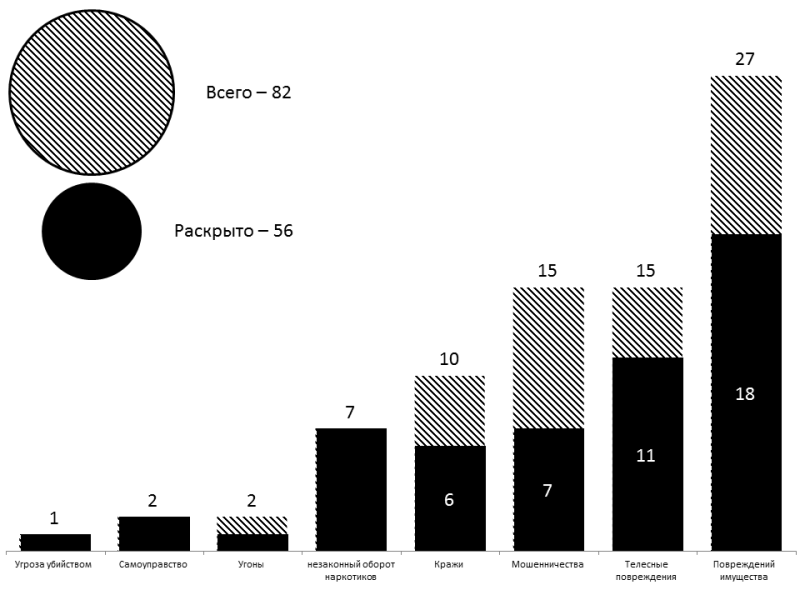 Зарегистрировано 82/56 обращения о происшествиях и преступлениях. Краж — 10/6, из машин — 1/0, в общественных местах — 6/5, прочих — 3/1. Мошенничеств — 15/7. Угонов — 2/1. Незаконного оборота наркотиков — 7/7, самоуправств — 2/2. Угроз убийством — 1/1. Телесных повреждений — 15/11, из них на бытовой почве — 5/5, из хулиганских побуждений — 10/6. Повреждений имущества — 27/18, дорожно-транспортных происшествий — 58. Административных правонарушений — 775, из них нарушений паспортных правил — 3, в сфере безопасности движения — 560. Мелких хулиганств — 13, появлений в общественных местах в пьяном виде — 52, за распитие спиртного в общественных местах — 104.