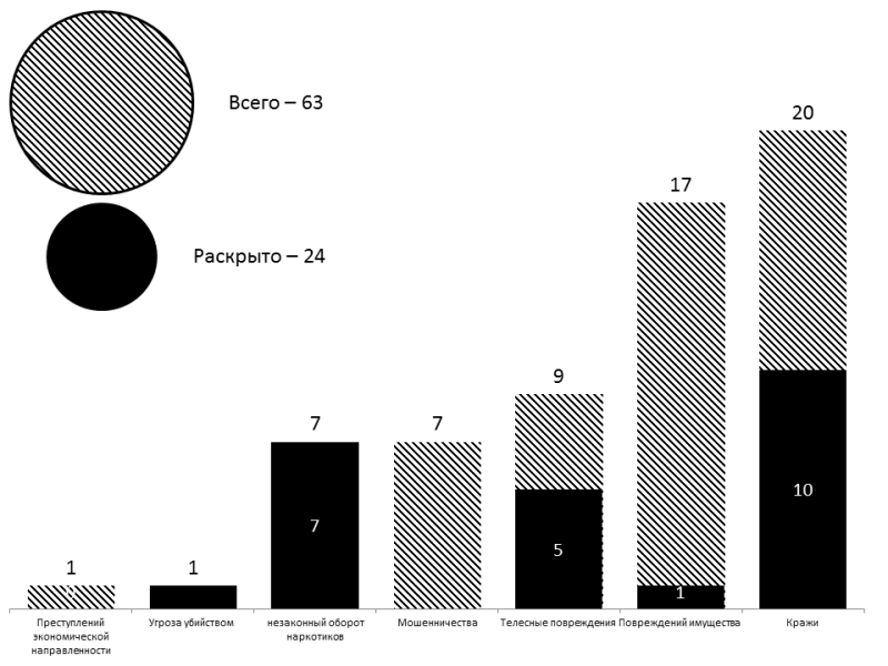 Зарегистрировано 63/24 обращения о происшествиях и преступлениях. Краж — 20/10, из квартир — 2/2, из машин — 2/0, из садовых обществ — 3/0, в общественных местах — 11/8, прочих — 2/0. Преступлений экономической направленности — 1/0. Мошенничеств — 7/0. Незаконного оборота наркотиков — 7/7. Угроз убийством — 1/1. Телесных повреждений — 9/5, из них на бытовой почве — 4/4, из хулиганских побуждений — 5/1. Повреждений имущества — 17/1, дорожно-транспортных происшествий — 30. Административных правонарушений — 168, из них нарушений паспортных правил — 3, в сфере безопасности движения — 633. Мелких хулиганств — 9, появлений в общественных местах в пьяном виде — 51, за распитие спиртного в общественных местах — 68.