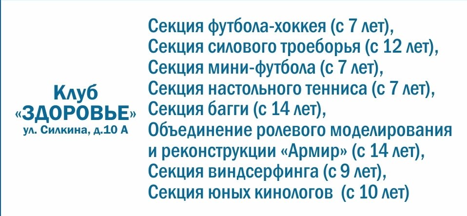 4 сентября в период с 17.30 до 20.00 в спортивном зале клуба «Здоровье» в рамках Дня Открытых Дверей будет представлена деятельность секций и объединений клуба: