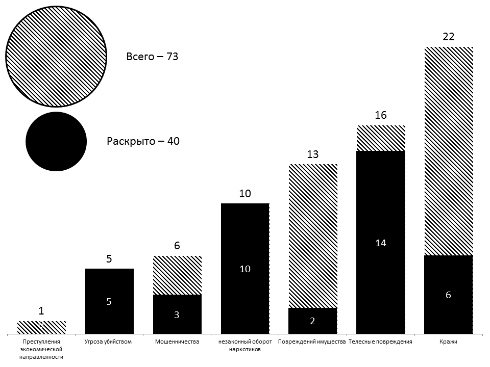 Зарегистрировано 73/40 обращения о происшествиях и преступлениях. Краж — 22/6, из гаражей — 1/0, из автомобилей — 2/0, в общественных местах — 9/5, прочих — 10/1. Преступлений экономической направленности — 1/0. Мошенничеств — 6/3, незаконного оборота наркотиков — 10/10. Телесных повреждений — 16/14, из них на бытовой почве — 2/2, из хулиганских побуждений — 14/12. Угроз убийством — 5/5. Повреждений имущества — 13/2. Суицидов — 2. Дорожно-транспортных происшествий — 38. Административных правонарушений — 665, из них нарушений паспортных правил — 13, в сфере безопасности движения — 489, в состоянии опьянения — 5. Мелких хулиганств — 4, появлений в общественных местах в пьяном виде — 33, за распитие спиртного в общественных местах — 67.