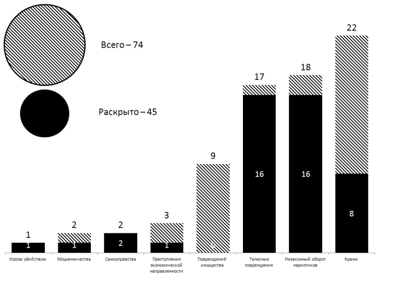 Краж — 22/8, из квартир 1/1, из гаражей 1/0, с садовых участков — 1/0, из автомобилей — 4/0, в общественных местах — 7/4, прочих — 8/2.