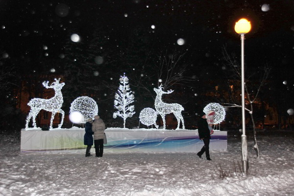 Забавные снеговики и сверкающие олени украсили город накануне Нового года. Светящиеся композиции появились в сквере около фонтана на проспекте Мира и около кинотеатра «Молодежный». На улице Зернова, от КПП-3 до перекрестка с ул. Арзамасской, установлены световые консоли с российским триколором, гербами Нижегородской области и города Сарова.
