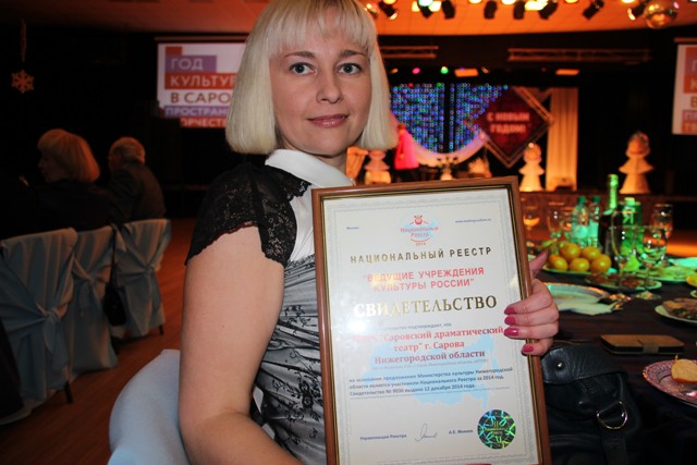 Среди отмеченных особых аплодисментов заслужили два учреждения. Детская школа искусств получила диплом конкурса «100 лучших школ России», а Наталья Колповская отмечена почтенным знаком «Директор года». В национальный реестр «Ведущие учреждения культуры России» на основании предложения минкульта Нижегородской области включен Саровский драматический театр. Свидетельство № 9036 от 12 декабря 2014 года глава администрации вручил директору театра Марине Першиной.
