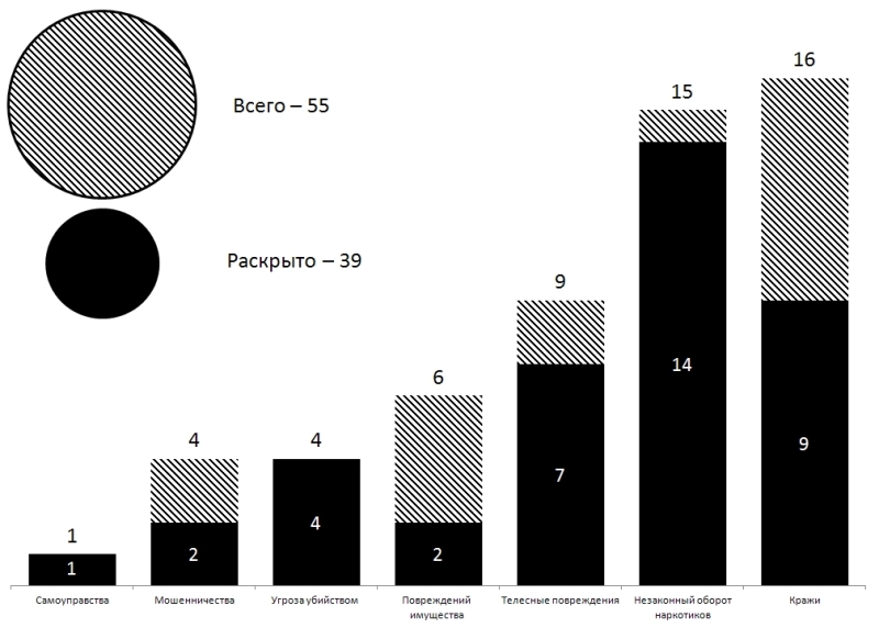 16 краж (раскрыто 9): из квартиры — 2 (2), из автомашин — 2 (0), в общественных местах — 7 (6), прочих — 5 (1).