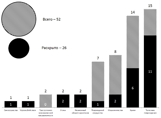 Телесных повреждений — 15/11, из них на бытовой почве — 1/1, из хулиганских побуждений — 14/10.