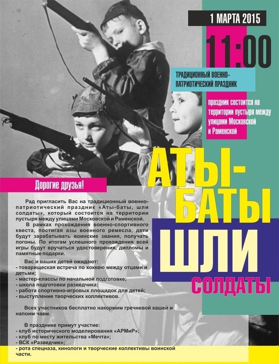 Депутаты городской думы приглашают всех желающих принять участие в празднике «Аты-баты, шли солдаты», уже ставшем традиционным, который состоится 1 марта в 11 часов на пустыре между улицами Московской и Раменской.