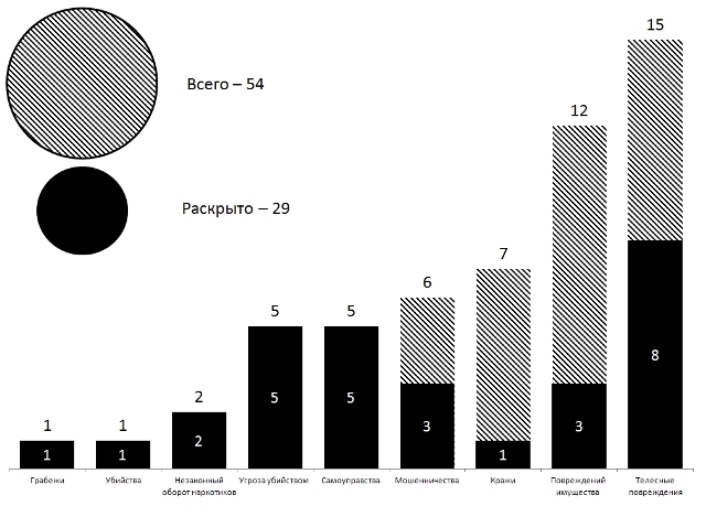 Краж — 7/1, из автомашин — 1/0, в общественных местах — 2/1, прочих — 4/0.