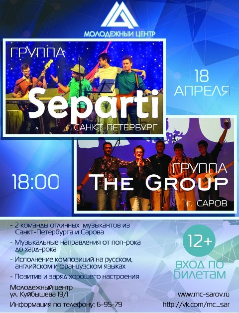 Всех ценителей качественной рок-музыки Молодежный центр приглашает к себе 18 апреля. Для вас выступят ребята из Санкт-Петербурга — группа «Separti», и полюбившиеся многим саровчане — «The Group». Море драйва и позитива обеспечены каждому, кто проведет этот субботний весенний вечер в Молодежном центре в 18:00.