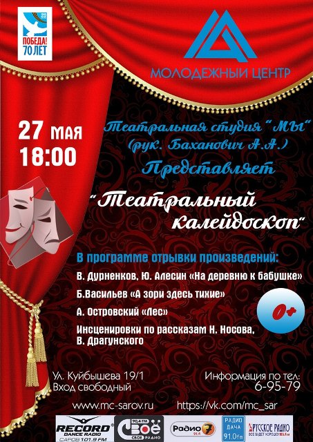27 мая в 18.00 воспитанники театральной студии «МЫ» под руководством известного саровского актёра Александра Бахановича представят спектакль «Театральный калейдоскоп». В программе вечера постановки по произведениям известных авторов: В. Дурненкова, Ю. Алесина «На деревню к бабушке», Б. Васильева «А зори здесь тихие», А. Островского «Лес», а также инсценировки по рассказам В. Драгунского и Н. Носова.