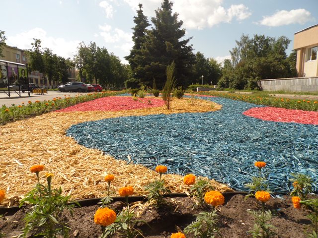 Специалисты Комбината благоустройства 8 июня завершили оформление городских клумб по новому методу. Впервые вместо привычной гранитной или мраморной крошки была использована цветная щепа.