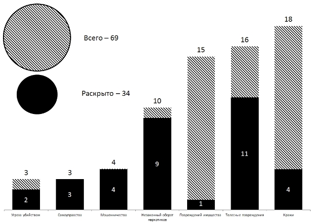 Зарегистрировано 69/34 обращений о происшествиях и преступлениях. Краж — 18/4, из садовых обществ — 2/0, из автомобилей — 2/0, в общественных местах — 3/3, прочих — 11/1. Мошенничеств — 4/4, незаконного оборота наркотиков — 10/9, самоуправств — 3/3. Телесных повреждений — 16/11, из них на бытовой почве — 2/2, из хулиганских побуждений — 14/9. Угроз убийством — 3/2. Суицидов — 1. Попыток суицида — 2. Повреждений имущества — 15/1, дорожно-транспортных происшествий — 28. Административных правонарушений — 734, в сфере безопасности движения — 525, в состоянии опьянения — 13. Мелких хулиганств — 8, появлений в общественных местах в пьяном виде — 28, за распитие спиртного в общественных местах — 99.