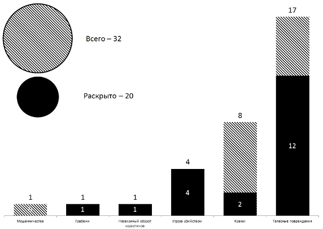 Зарегистрировано 48 сообщений о преступлениях и происшествиях. В 24 случаях причастные лица установлены. Краж — 8/2, из квартир 1/0, из гаражей — 1/0, с садовых участков — 2/1, в общественных местах — 3/1. Грабежей — 1/1, мошенничеств — 1/0, незаконного оборота наркотиков 1/1. Угроз убийством — 4/4. Причинений телесных повреждений — 17/12, из них на бытовой почве — 4/4, из хулиганских побуждений — 13/8.