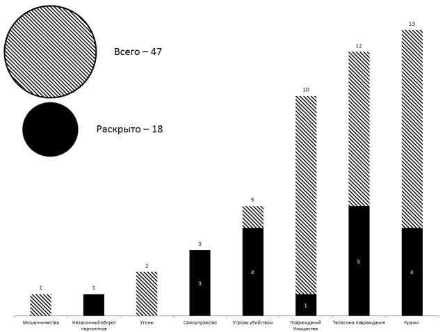 Зарегистрировано 47/18 обращений о происшествиях и преступлениях. Краж — 13, из квартир — 4/1, с садовых участков — 1/0, из автомобилей — 1/0, в общественных местах — 3/3, прочих — 4/0. Мошенничеств — 1/0, незаконного оборота наркотиков — 1/1, самоуправств — 3/3. Угонов — 2/0. Телесных повреждений — 12/5, из них на бытовой почве — 5/5, из хулиганских побуждений — 7/0. Угроз убийством — 5/4. Повреждений имущества — 10/1. Суицидов — 2. Дорожно-транспортных происшествий — 16. Административных правонарушений — 541, из них нарушений паспортных правил — 3, в сфере безопасности движения — 376, в состоянии опьянения — 10. Мелких хулиганств — 7. Появлений в общественных местах в пьяном виде — 28, а распитий спиртного — 86, за появление в общественных местах в состоянии наркотического опьянения — 7.