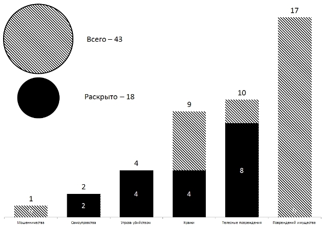 Зарегистрировано — 43/18. Краж — 9/4, из гаражей — 1/0, с садовых участков — 1/0, в общественных местах 4/4, прочих — 3/0. Мошенничеств — 1/0, самоуправств — 2/2, угроз убийством — 4/4. Причинений телесных повреждений — 10/8, на бытовой почве — 4/4, из хулиганских побуждений — 6/4. Повреждений имущества — 17/0. ДТП — 9. Административных правонарушений — 673. Нарушений паспортных правил — 6. В сфере БДД — 519 (в том числе 5 — за управление транспортным средством в состоянии алкогольного опьянения). Мелких хулиганств — 9. Появлений в общественных местах в пьяном виде — 27, за нахождение в состоянии наркотического опьянения — 3. Распитий спиртных напитков в общественных местах — 78.