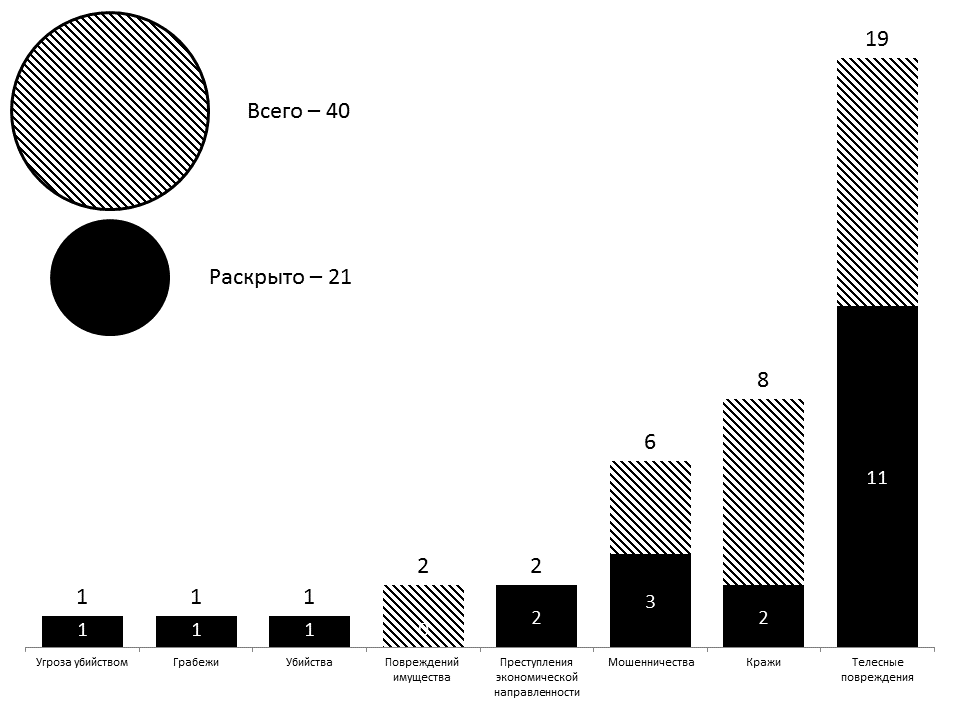 Зарегистрировано 40/21 обращений о происшествиях и преступлениях. Убийств — 1/1. Грабежей — 1/1. Краж — 8/2, с садовых участков — 1/0, в общественных местах — 3/2, прочих — 4/0. Мошенничеств — 6/3. Преступлений экономической направленности — 2/2. Угроз убийством — 1/1. Попыток суицида — 2. Причинений телесных повреждений — 19/11, на бытовой почве — 4/4, из хулиганских побуждений — 15/7. Повреждений имущества — 2/0. Административных правонарушений — 615, из них в сфере БДД — 470. ДТП — 16. Управляли транспортными средствами в состоянии алкогольного или наркотического опьянения либо отказались от медицинского освидетельствования — 8 (из них четверо повторно в течение года). Не пропустили пешеходов — 4. Нарушений требований дорожных знаков и разметки — 136. Тонировка — 11. Переходов дороги в неустановленном месте — 47. Нарушений паспортных правил — 15. Мелких хулиганств — 10. Появлений в общественных местах в состоянии алкогольного опьянения — 23, наркотического — 2. Распитий спиртных напитков в общественных местах — 95.