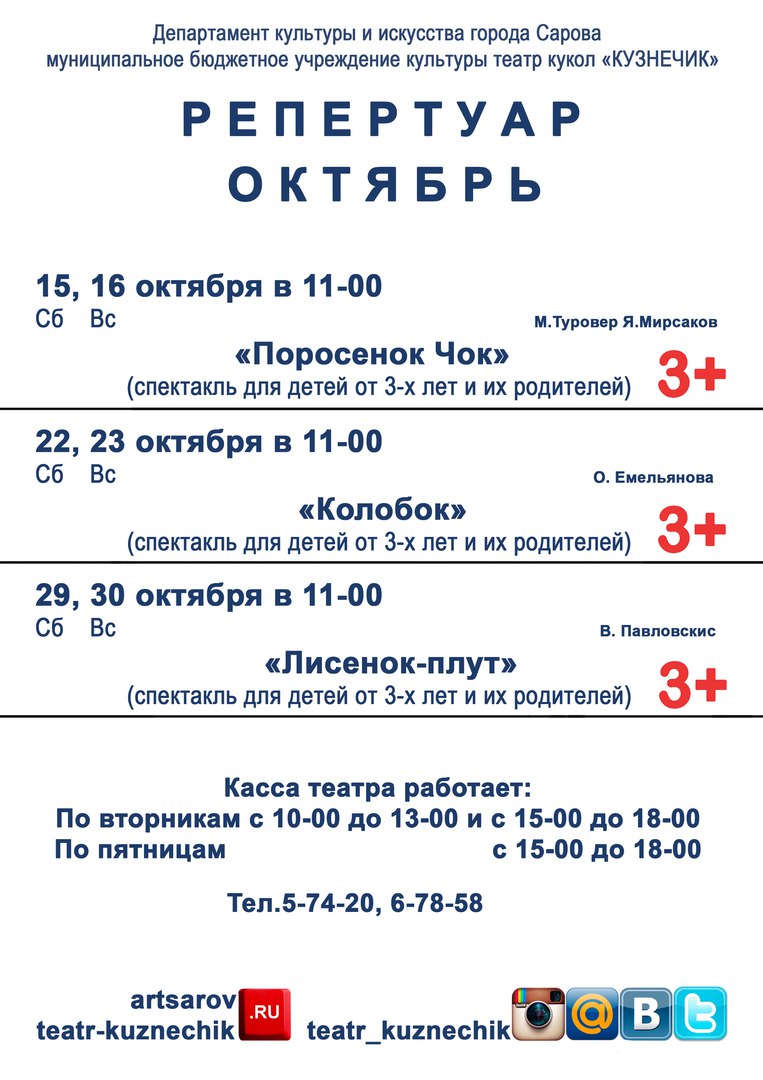 Театр кукол «Кузнечик» приглашает горожан на открытие 22 сезона, которое пройдет 15 октября в 11−00. Для юных саровчан и их родителей коллектив театра подготовил спектакль «Поросенок Чок» по одноименной пьесе Михаила Туровера и Яна Мирсакова. Также в репертуаре на октябрь спектакли «Колобок» и «Лисенок-плут», а к новогодним праздникам «Кузнечик» готовит премьеру — спектакль по произведениям Самуила Маршака «Жил на свете мальчик Петя».