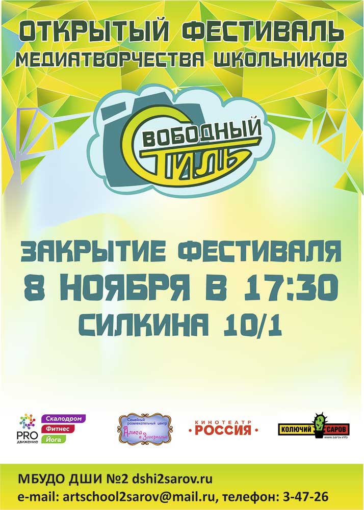 8 ноября 2016 года в 17.30 Детская школа искусств № 2 приглашает гостей на подведение итогов и закрытие Открытого фестиваля медиатворчества школьников «Свободный стиль».